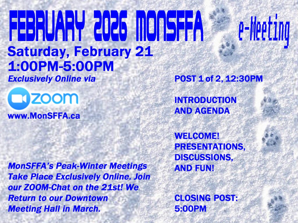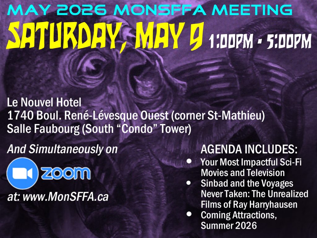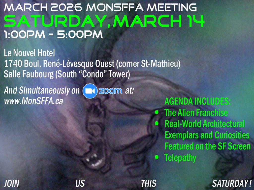 Welcome to MonSFFA’s April 2026 meeting! We are gathering, today, in-person downtown, and online via ZOOM, to share our passion for sci-fi! Join our ZOOM-chat and take part from the comfort of home! Proceedings will be getting underway shortly. See the instructions, immediately below (Item 2).