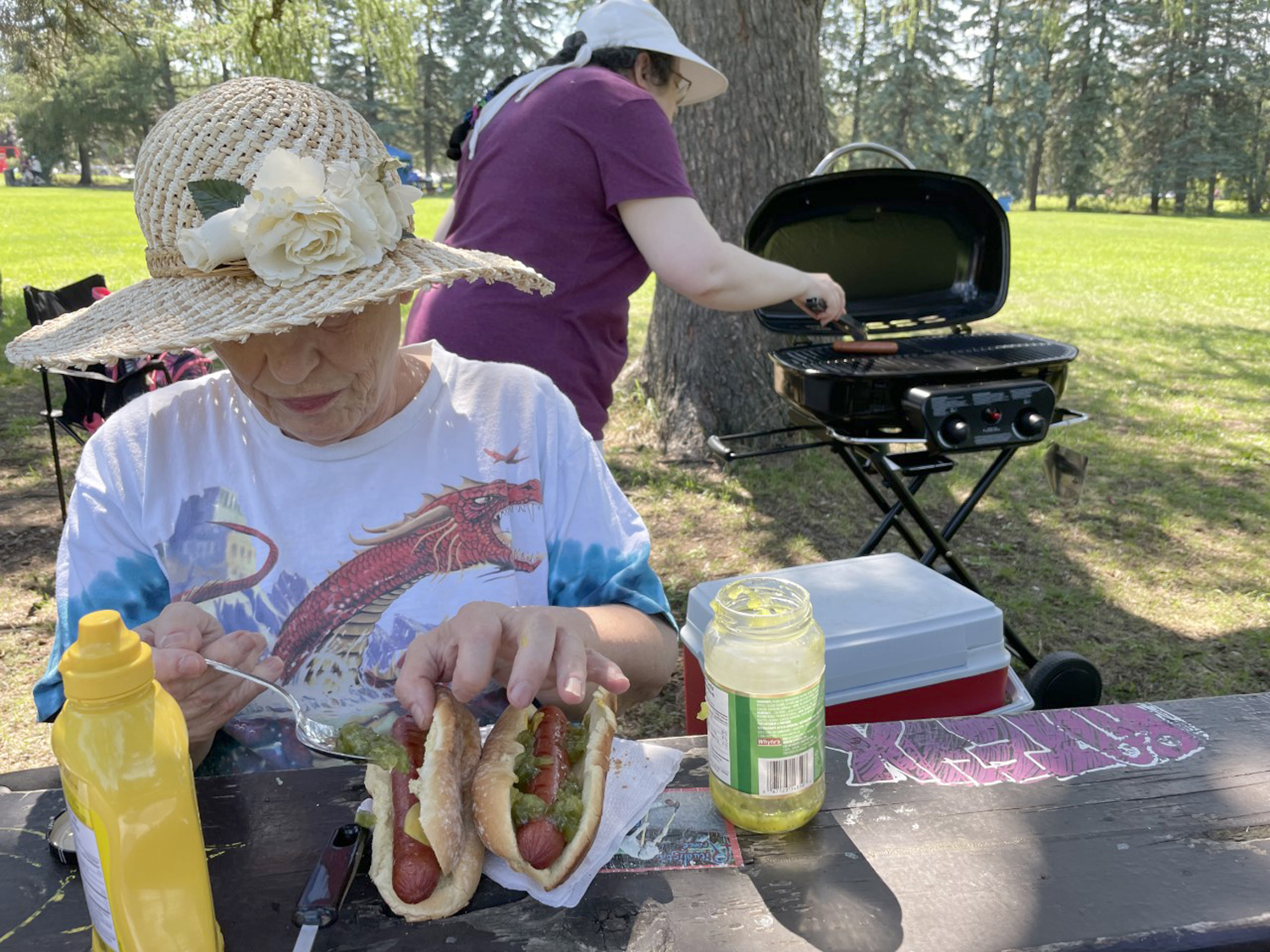 BBQ 2, Cathy dresses hotdogs while Josée grills 2022-09-09 1500 × 1125 BBQ 2, Cathy dresses hotdogs while Josée grills Photo by Keith Braithwaite