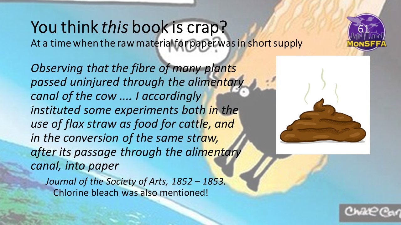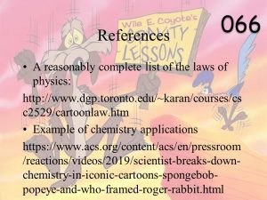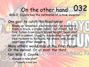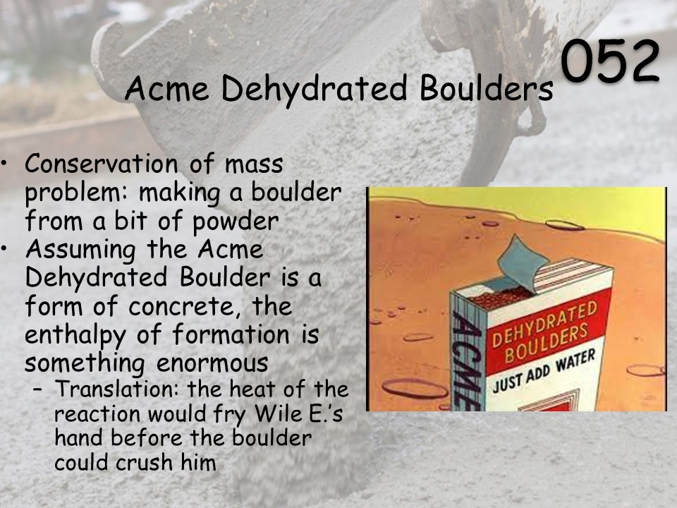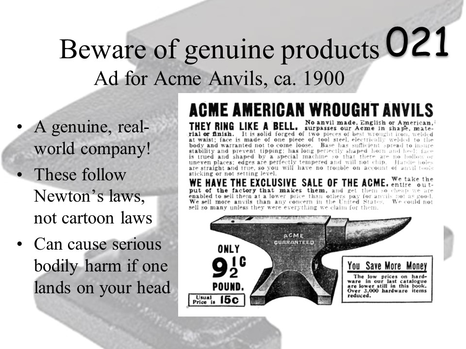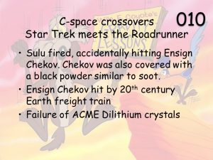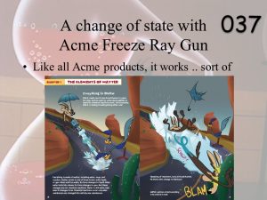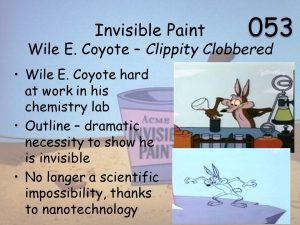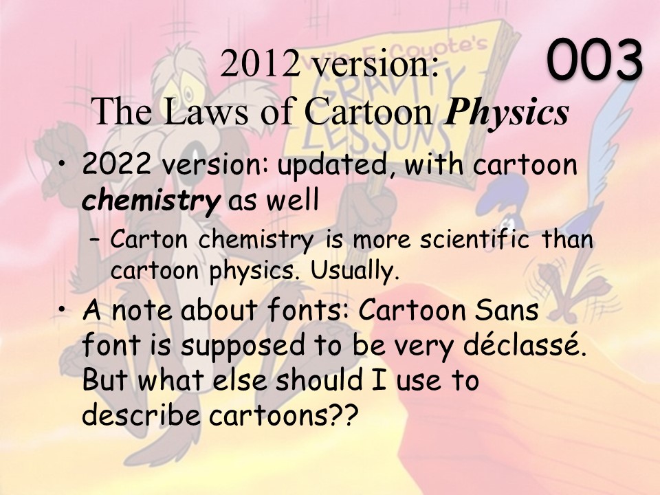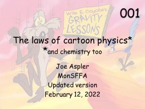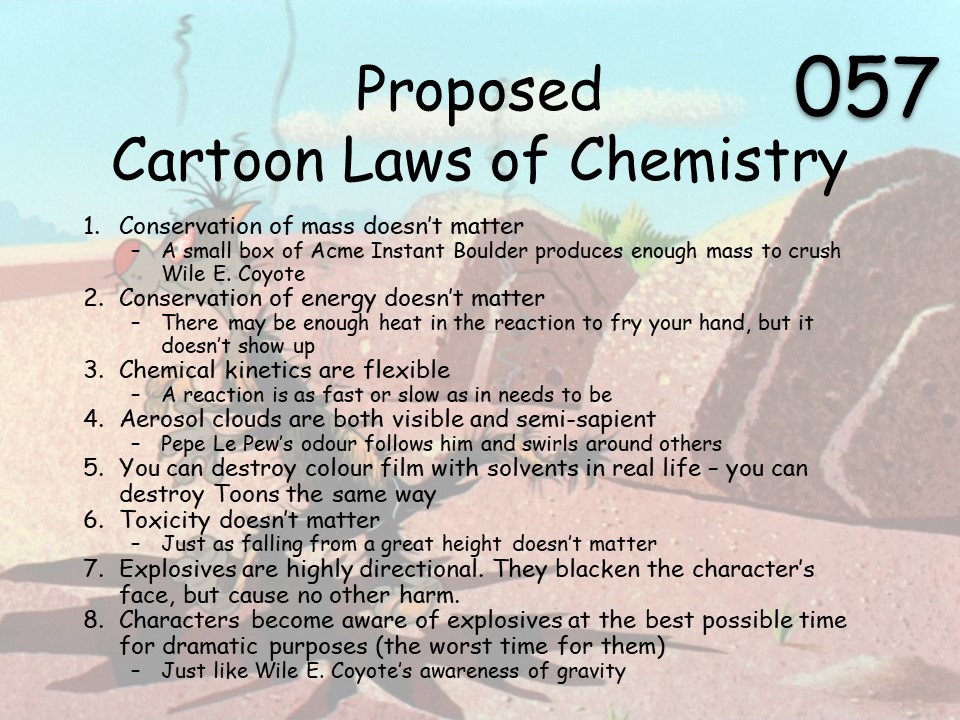 About 10 years ago, I gave a MonSFFA presentation on the Cartoon Laws of Physics. One of the flaws in the Cartoon Laws of Physics is … nothing has been said about chemistry. And so I’ve updated my old presentation with a proposal (possibly for the first time) that the famed Cartoon Laws of Physics should be supplemented by the Cartoon Laws of Chemistry.
