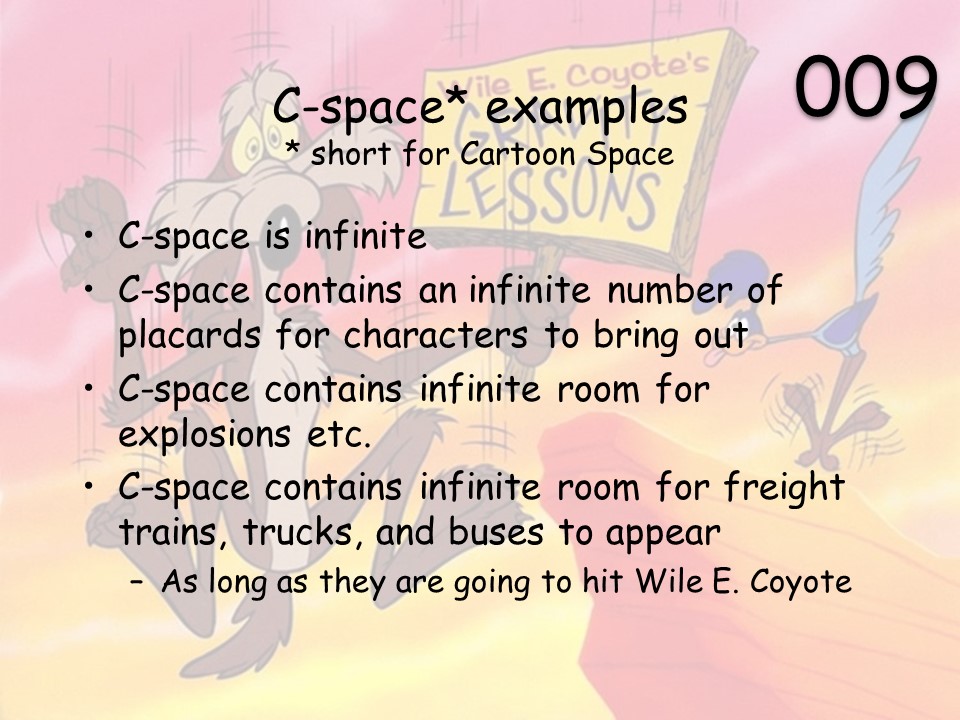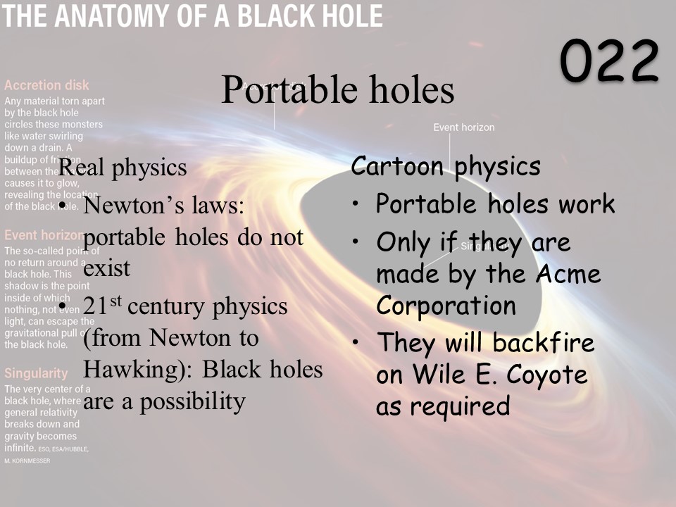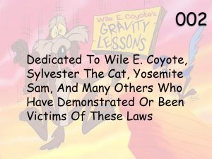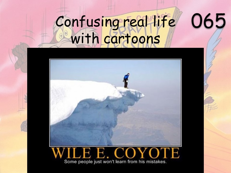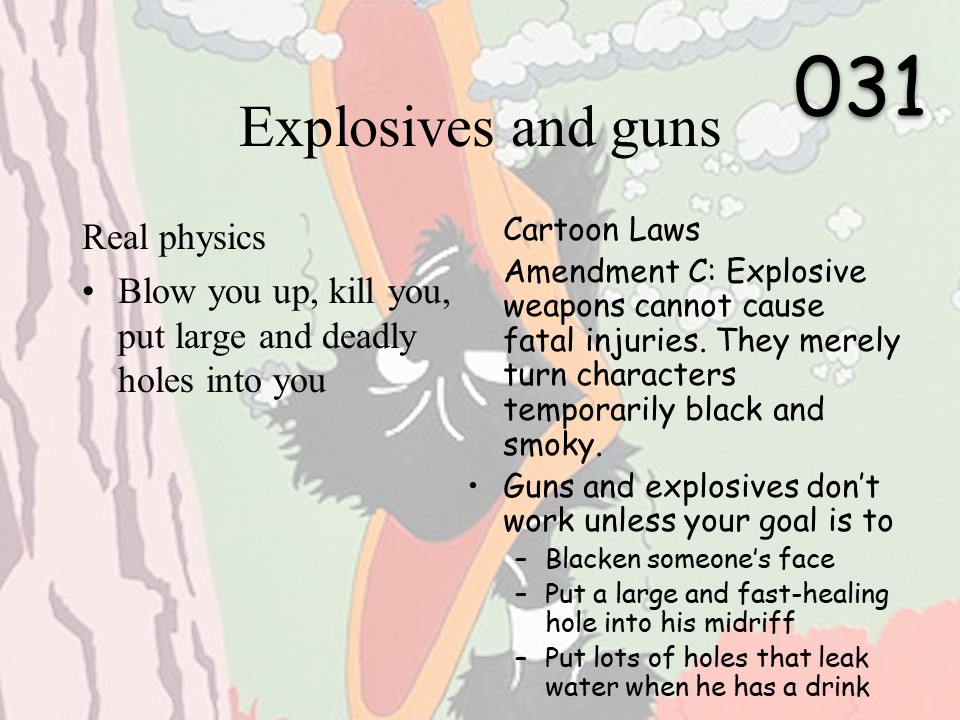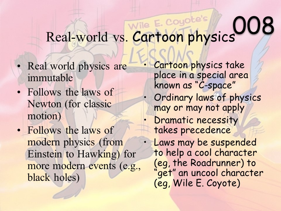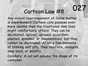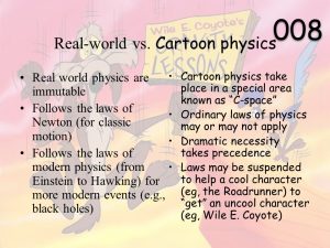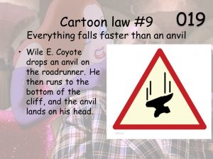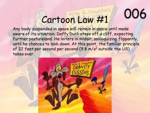 We live in a world of science. We also live in a world of cartoons. Naturally, cartoon creators have their own self-consistent rules of science. The best known: Wile E. Coyote runs into thin air, but only falls after he looks down. Another character is shot by a cannonball, but the perfectly circular hole in his middle heals rapidly with no aftereffects.