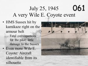 Some of the Cartoons Laws of Science have been confirmed in real life, at least partially. One such case occurred during World War II, in the interaction between the British heavy cruiser HMS Sussex and a kamikaze pilot. The kamikaze lost.