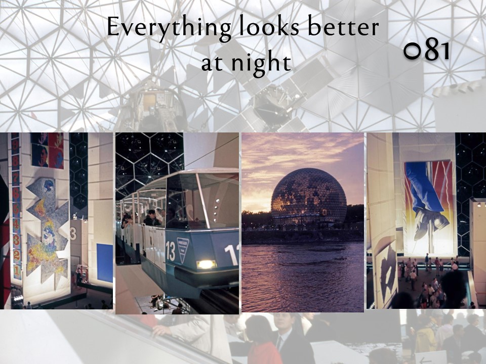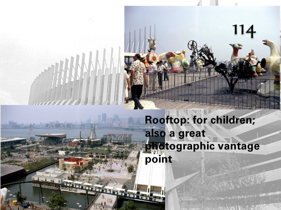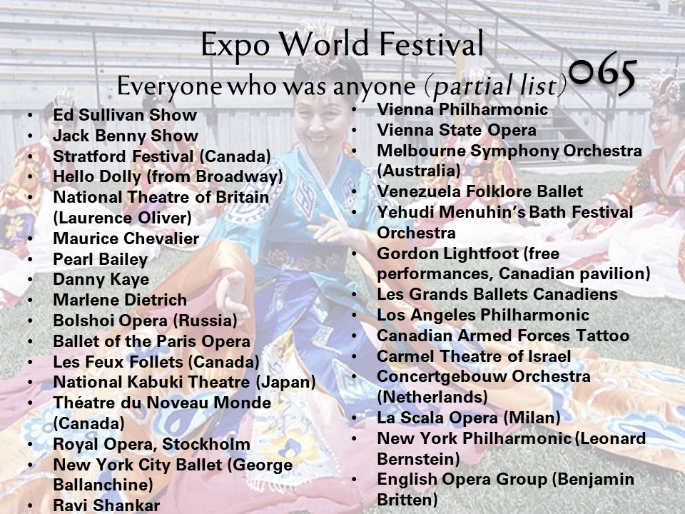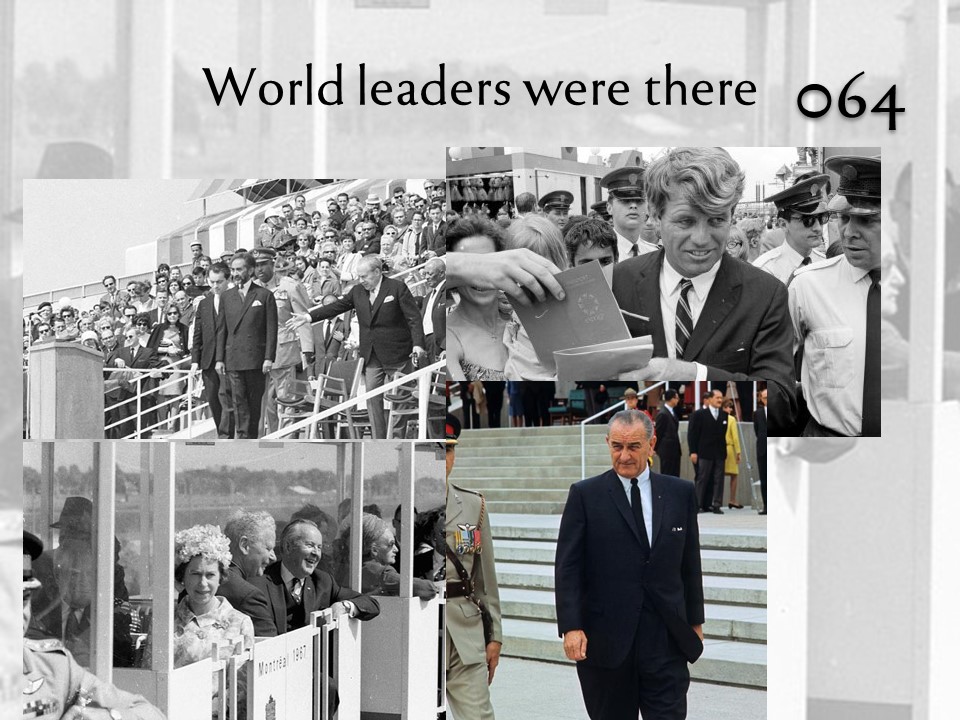 Rather than pavilions conforming to cookie-cutter designs, the finest architects provided their imagination. Designers, filmmakers, and others put together a 1,000-acre showplace and playground. Everyone who was anyone was in Montreal that summer, from performers to world leaders.