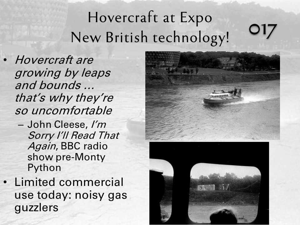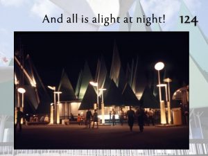 Expo showed us the future. Computers examined problems that today, a 12-year-old could carry out on their smartphones. We could use the videotelephone. We could see a model of Air Canada’s supersonic transport, already on order for service in the far-off year of 1980. We could ride on the new-fangled Hovercraft. We could take a monorail, although it was called the minirail – this was the 60s after all. We could stand in line for hours to see the Labyrinth: the forerunner of IMAX. In the pavilion of the Indians of Canada, the First Nations told their story, which was different (to say the least) from patronizing, romanticized displays at earlier World’s Fairs.
