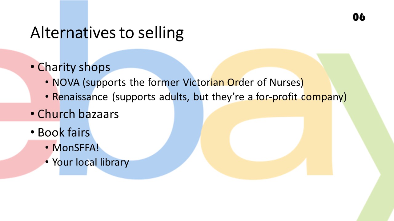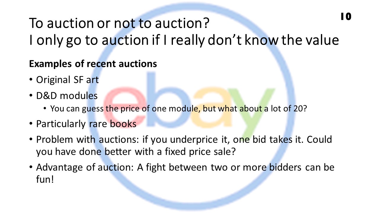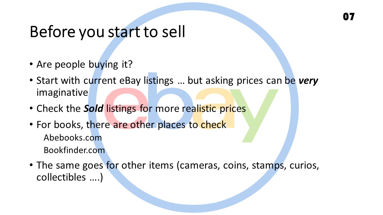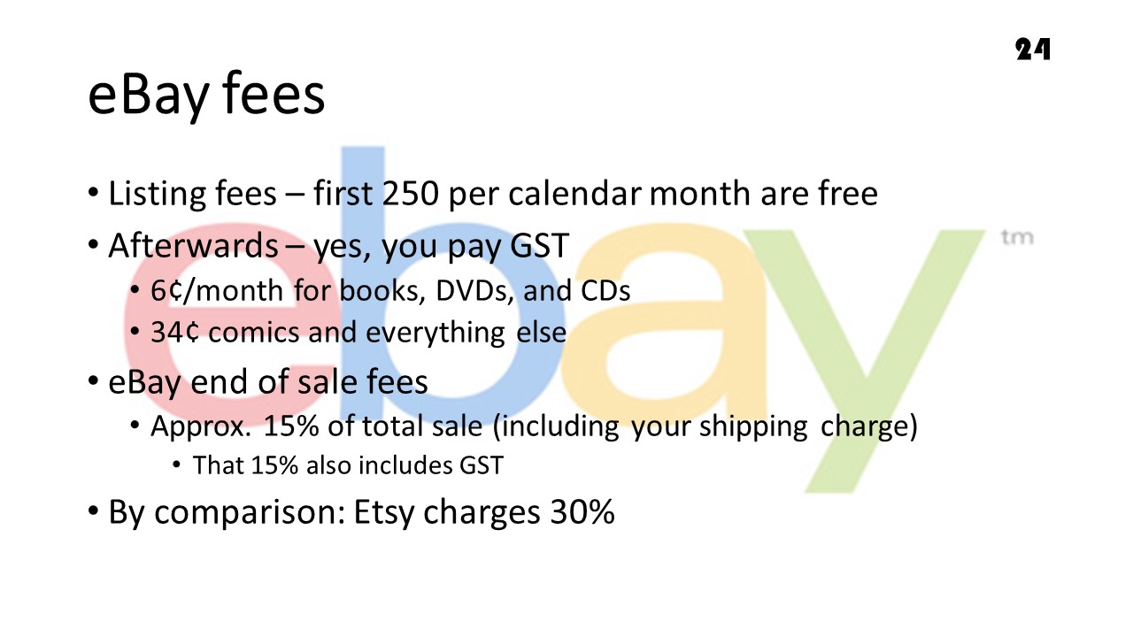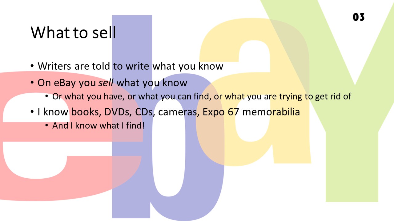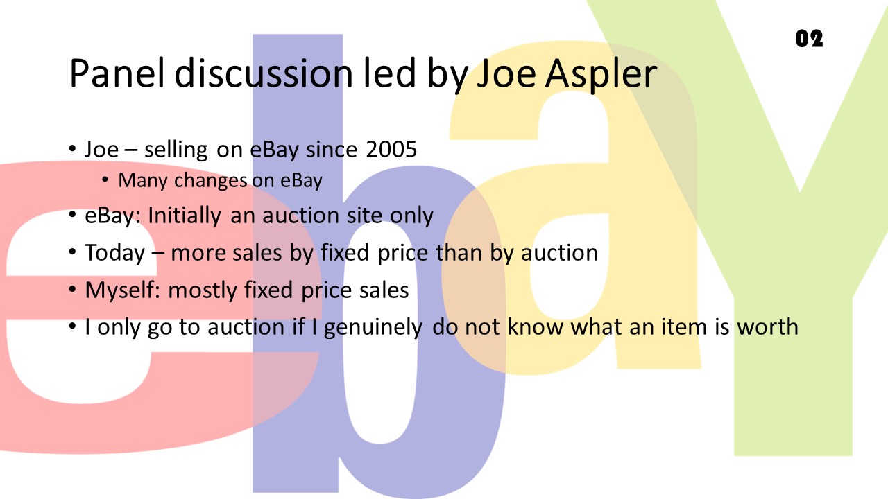 This panel discussion gives an introduction to sales on eBay, including the trials and tribulations of finding material, how to price it, how to ship it, and how to deal with feedback. Yes, and the taxman may cometh as well.