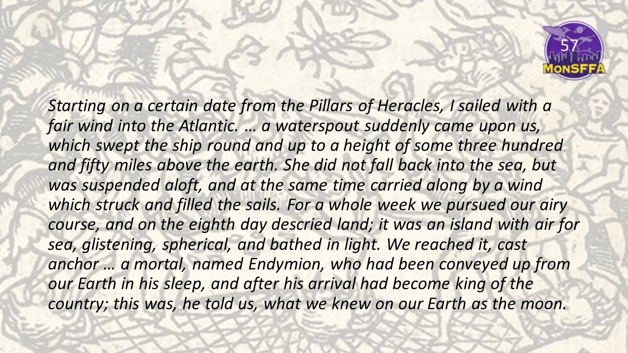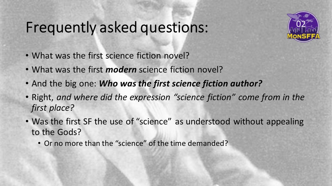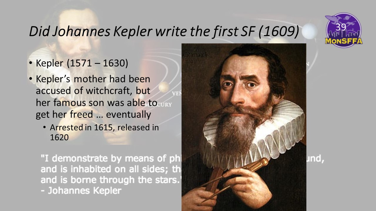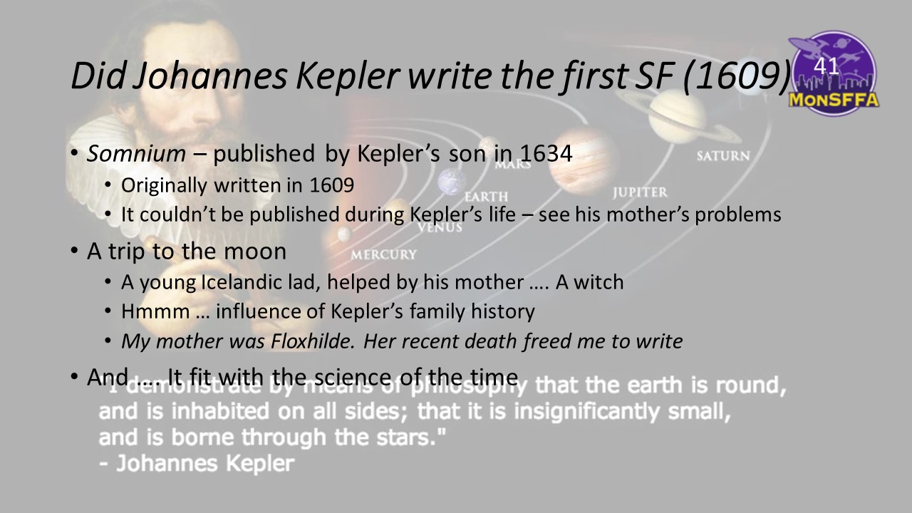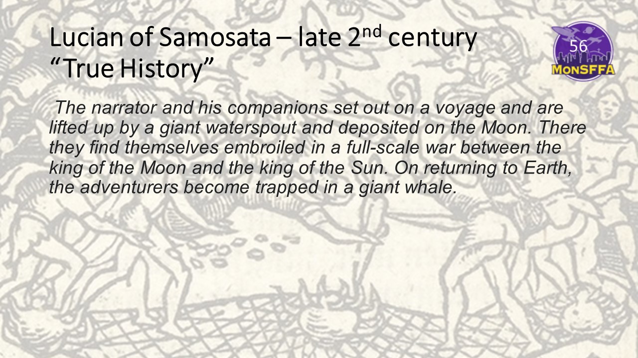 SCIENCE FICTION BEFORE IT WAS CALLED SCIENCE FICTION—We look at works of proto-SF. Tales of travel to other worlds, of alien beings and robots, and of interplanetary war date back decades and centuries prior to the publication of Mary Shelley’s Frankenstein, often cited as the first true science fiction story. Well before the term “science fiction” was coined, works such as Johanne Kepler’s Somnium and Lucian of Samosata’s satire True History included elements of what, today, we define as SF! We’ll examine these and other works of science fiction before it was called science fiction.