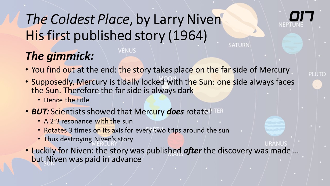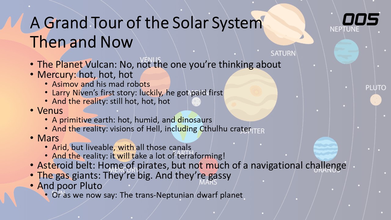 From the earliest days of science fiction, space travellers travelled to the Moon, to Mars, to Venus, and to the other planets as they were discovered. Early science fiction – before the late 19th century – treated the planets as just different earths. Science fictional tropes from the late 19th century right to the Space Age declared Mercury to be an oven on the side facing the sun and a freezer on the other. Venus was a planet of swamps, jungles, and dinosaurs. Mars was a cool desert planet, with all the water in the canals.