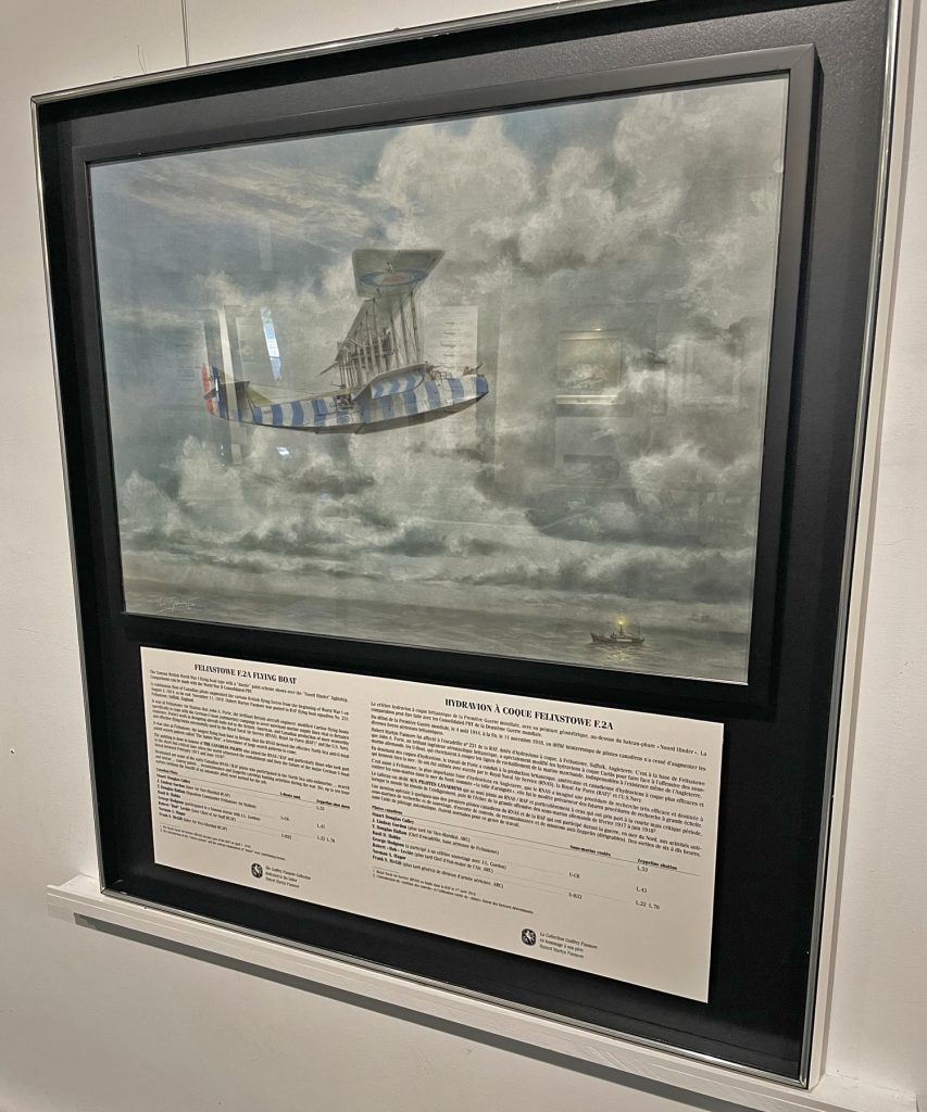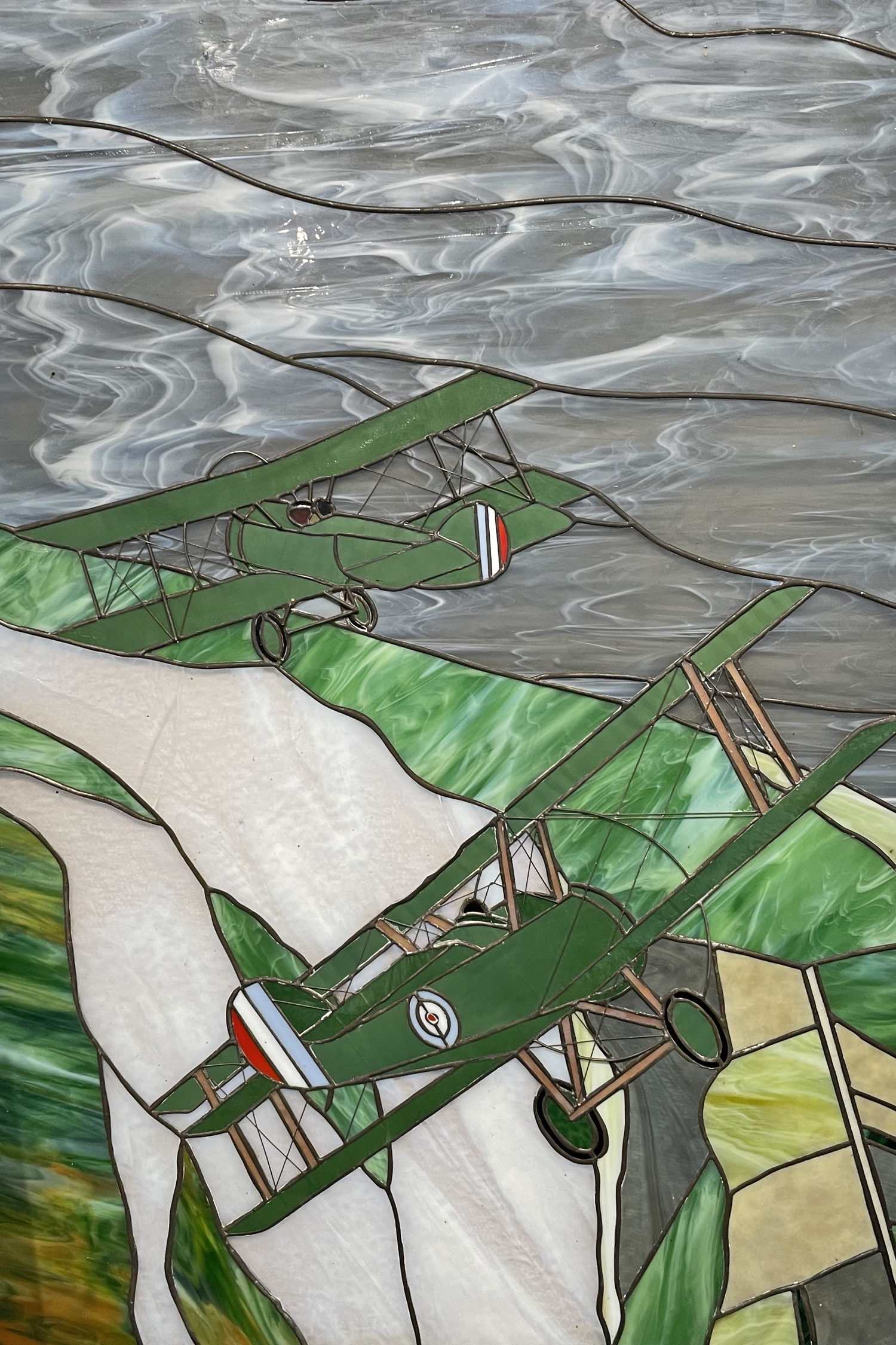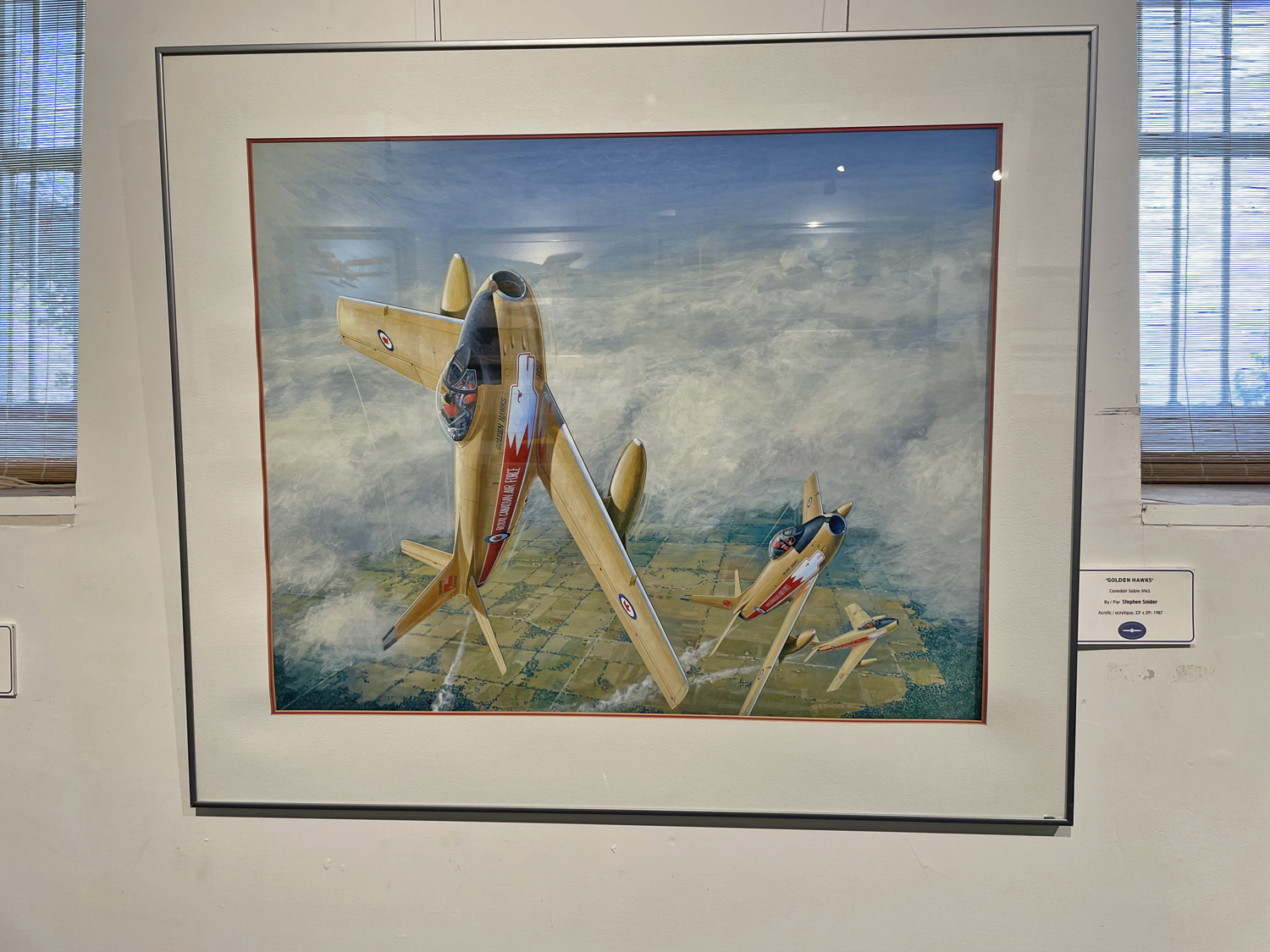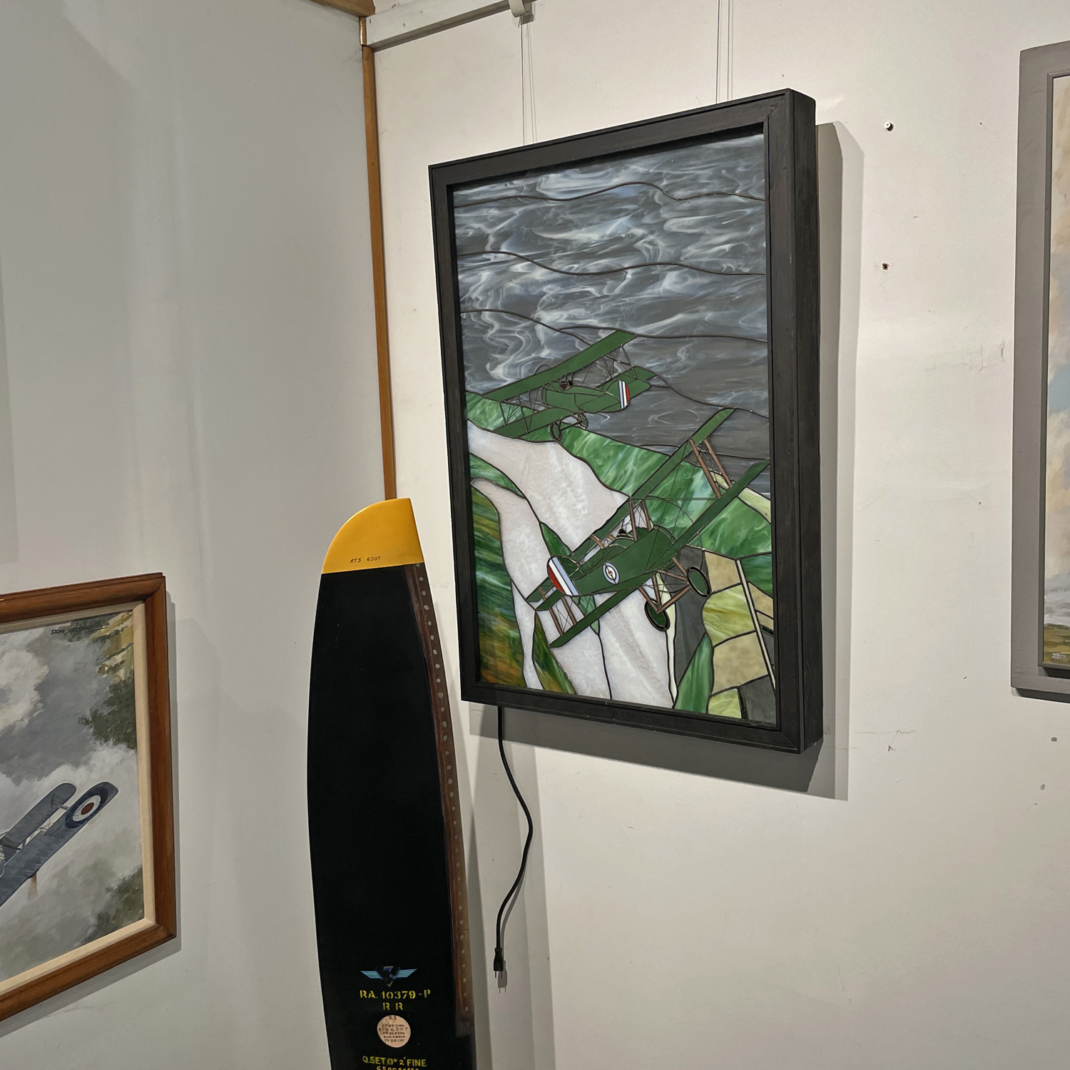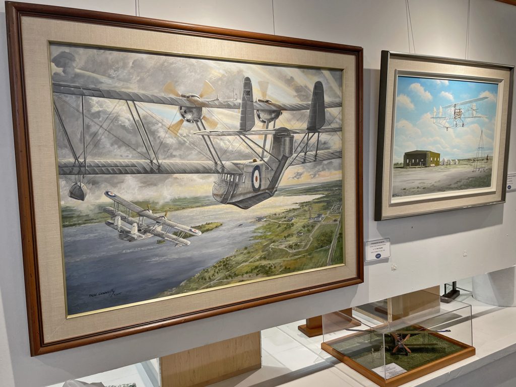 Last, but certainly not least, an exquisite collection of aviation art was hung in the museum’s gallery, including a stained-glass piece that drew the attention of MonSFFA president Cathy Palmer-Lister, whose hobbies include the fashioning of such works. Featured painters include Jim Bruce and Don Connelly.