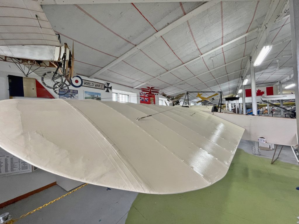 Large-scale model of Scarabée hangs above full-scale reconstruction of aircraft
