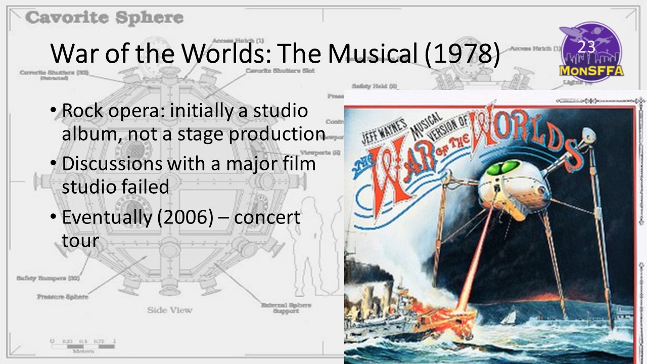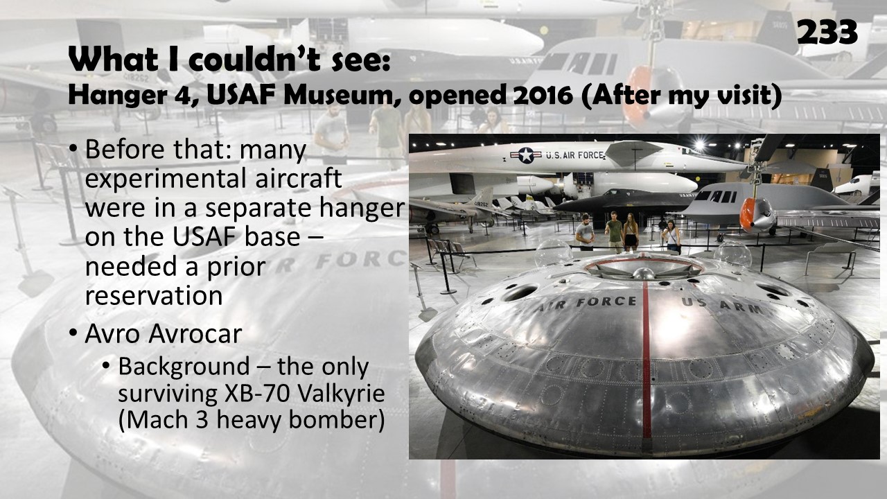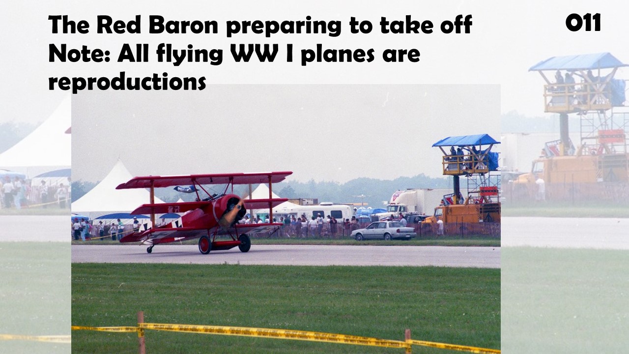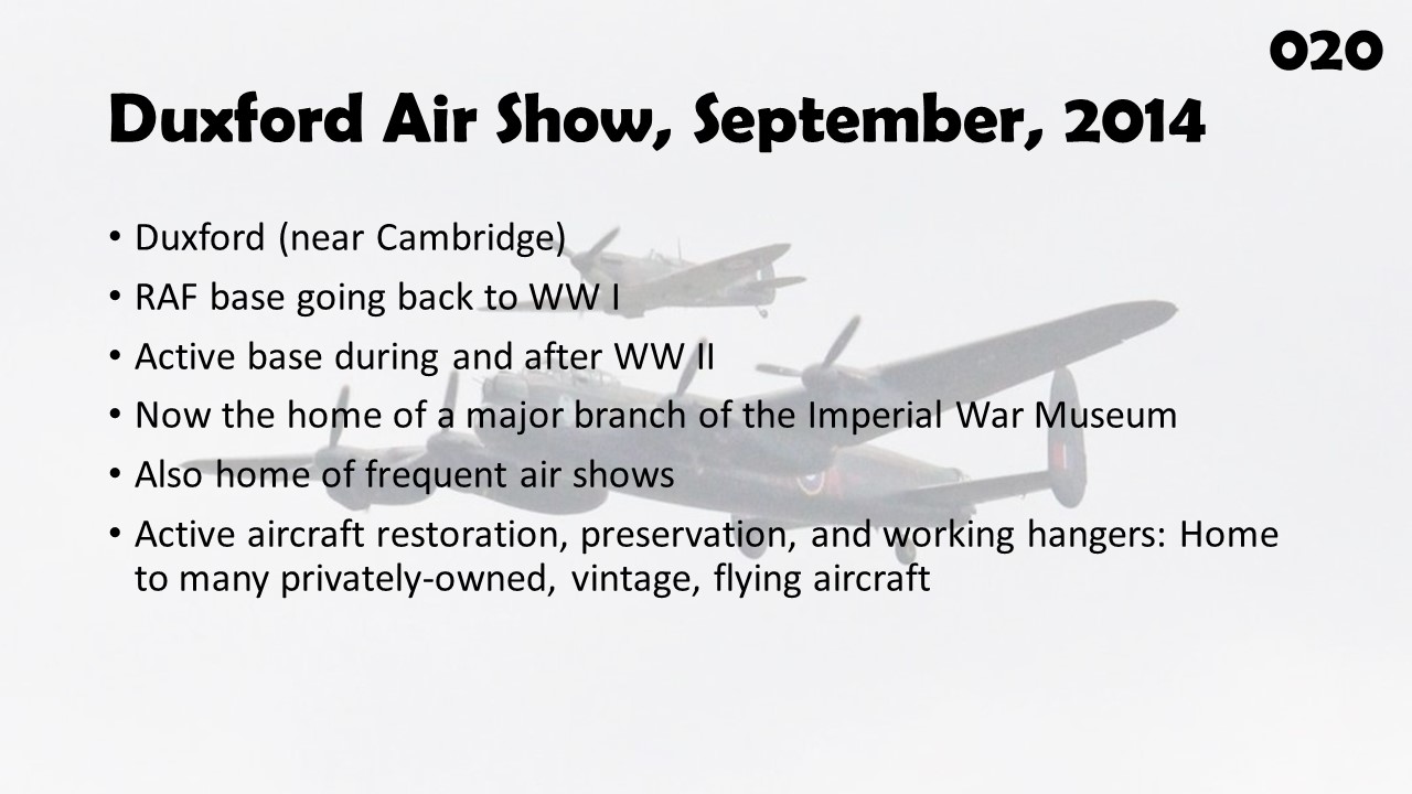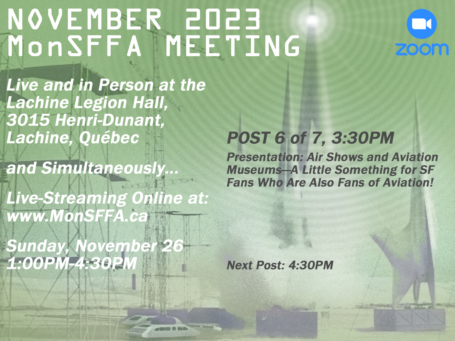 Many SF fans are modelers and fans of old airplanes. This is a presentation on airshows and aviation museums. These include the RAF Museums (London and Cosford), the National Air and Space Museum (Washington), the USAF Museum (Dayton), the Imperial War Museum (Duxford), the RCAF Museum (Trenton), and the Canadian Aviation and Space Museum (Ottawa).