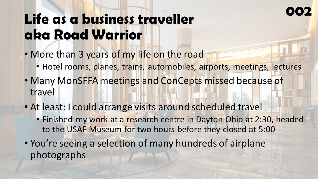 During my life as a business traveller, I spent the equivalent of more than three years on the road: airplanes, airports, hotels, meetings, taxis, rental cars….. That’s one reason why I missed so many monthly MonSFFA meetings, and several ConCepts as well. One benefit at least was that I could arrange side visits. Some destinations had air museums. Other destinations even had an air show.