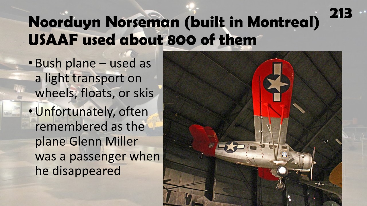 and the famous Noorduyn Norseman (here minus a wing), built in Montreal!