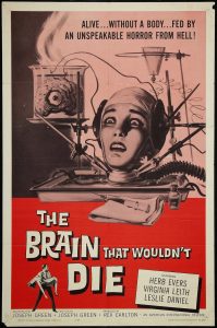 A sci-fi/horror effort about a mad doctor who has developed a means of keeping human body parts alive! When his beautiful girlfriend is severely injured in a car accident, he retrieves her severed head and sets her up in something like a roasting pan in his lab! Horrified with her predicament, she begs to be allowed to die, but he plans to commit murder in order to find another attractive woman upon whose body he can graft his sweetie’s head, Frankenstein-like!