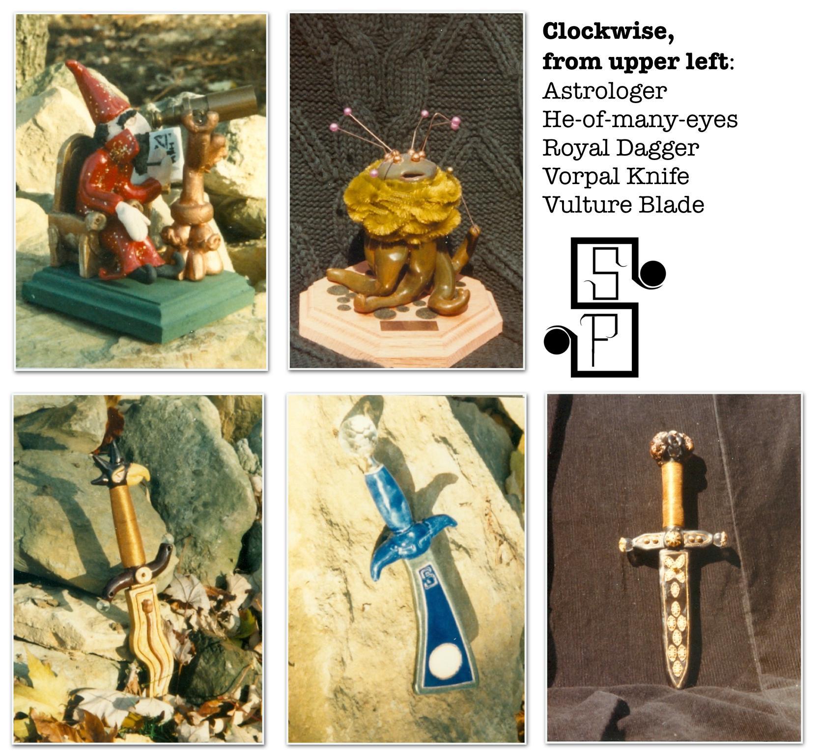 (Click a thumbnail to view the whole picture)The wyrm, Bilbo, and the gargoyle on the left are of cherry. the gargoyle on the right and the dragon letter opener are of black walnut.