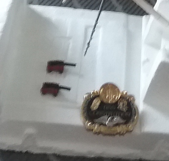 Wayne Glover is working on his model of the constitution. He has about 500 gun carriages to paint! The medallion is a souvenir Wayne purchased when he visited the actual ship. Click to view full size pics.