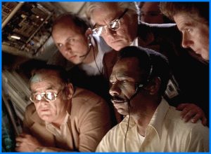 One of the most arresting such scenes plays out in the first reel of Steven Spielberg’s blockbuster Close Encounters of the Third Kind (1977). The taut sequence unfolds entirely from the perspective of air traffic controllers in radio communication with the pilots of commercial airliners during a UFO encounter. The audience is held rapt without ever seeing what the pilots see, or the apprehension on their faces as they react to avoid a collision, or a brightly glowing UFO alarmingly buzzing an airliner in the night skies. The white-knuckle drama is all realized simply but so effectively by the sound and cadence of the pilots’ voices crackling over the radio, and of the group of controllers responding as they monitor the occurrence.