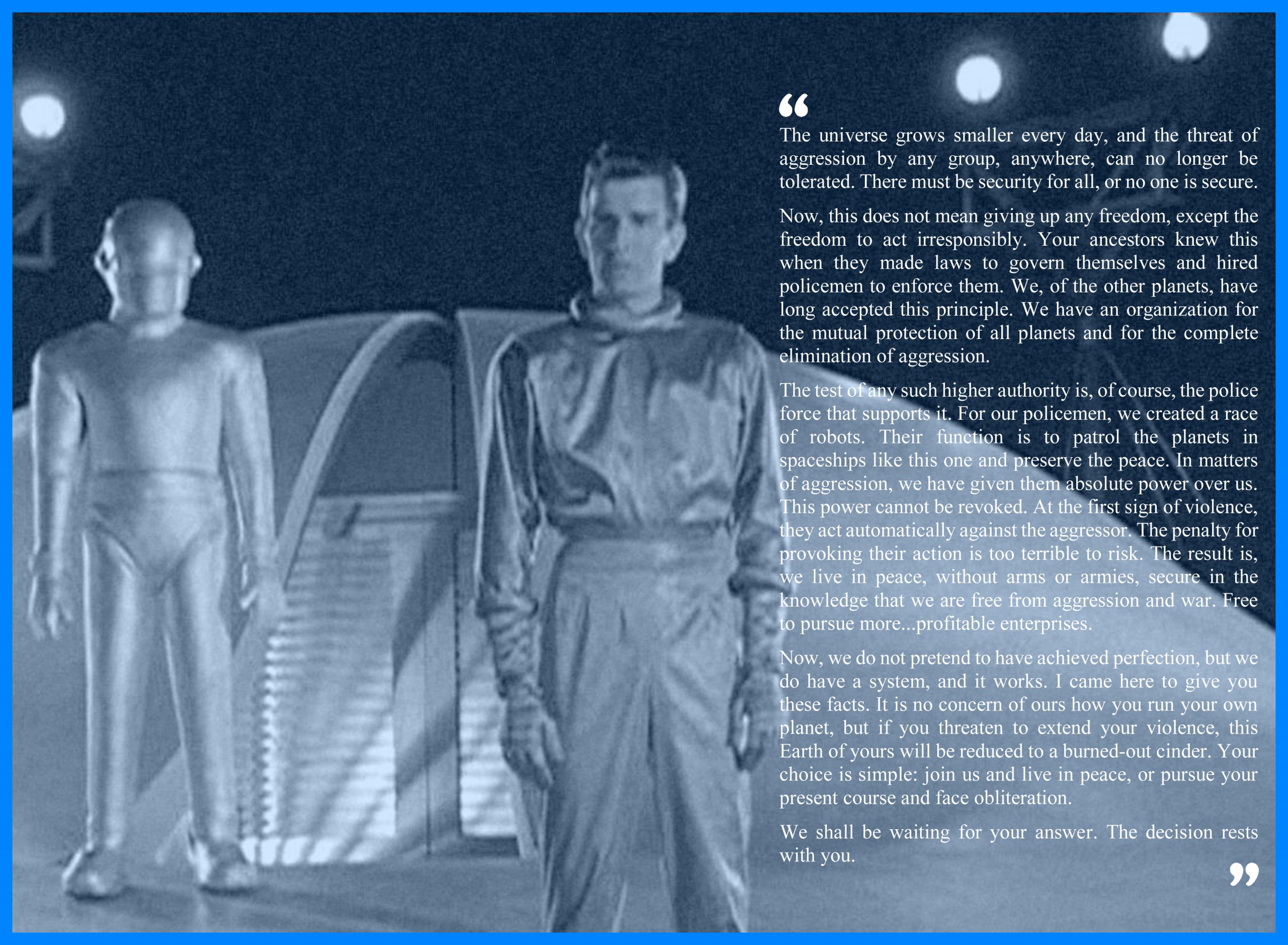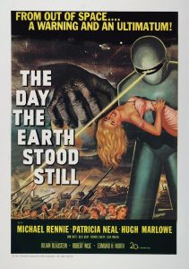 One of the most memorable of the early flying saucer films is The Day the Earth Stood Still (1951), in which alien emissary Klaatu and his robot enforcer, Gort, land in Washington, D. C. in a sleek, shiny flying saucer to convey an ultimatum to the nations of the world. It is, today, considered a classic of the genre and remains one of the smartest science fiction films ever produced.