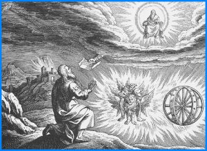 And in the ancient world, sightings of anomalous lights and glowing objects in the sky were interpreted as the actions of deities. The Hebrew prophet Ezekiel’s visions of what he saw as God can be found in the Bible. He describes an approaching windstorm in the form of a “great cloud, with brightness around it, and fire flashing forth continually, and in the midst of the fire, as it were gleaming metal.” Within this aura were four winged “cherubim,” or living creatures, humanoid in form. Beside each of these figures was a bizarre structure Ezekiel likened to a “wheel within a wheel” that sparkled like topaz, with rims “tall and awesome” and “full of eyes all around.” These wheels descended and rose in concert with the four creatures. UFOlogists have interpreted this Biblical event as a close encounter.