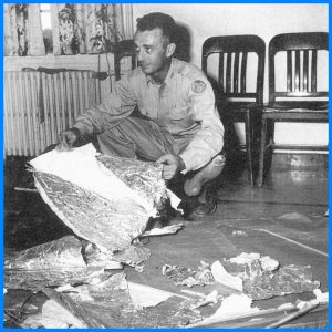 The sheriff contacted Major Jesse Marcel, chief intelligence officer at Roswell Army Air Field (RAAF), and Marcel and a plainclothesman accompanied Brazel back to the ranch to examine the debris. They gathered more of the pieces of what they presumed was a disabled balloon and its “kite.” A kite is a radar reflector, tethered to a balloon and used to track it from the ground.