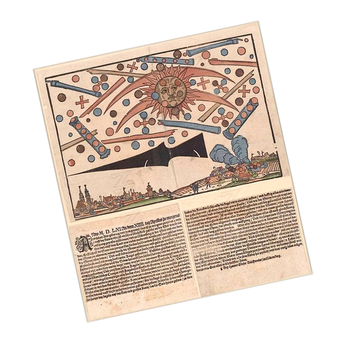 A similar event unfolded in the summer skies above Basel, Switzerland, in 1566. Many 15th- and 16th-century pamphlets and illustrated news broadsheets, the forerunners of newspapers, printed accounts of such “sky spectacles” and “miracles” seen across the continent. Modern scientists have suggested that these events were nothing more fantastical than solar eclipses or atmospheric singularities such as sun dogs.