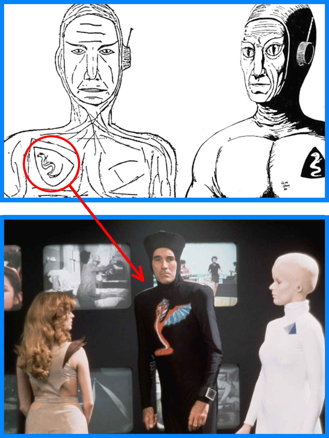 A version of Schirmer’s sketch of the winged serpent emblem made its way onto the set of the ever so cheesy low-budget Canadian UFO flick Starship Invasions (1977) as a costume element. Playing the leader of the story’s evil alien Legion of the Winged Serpent, Hammer Horror icon Christopher Lee sported the emblem on the breast of his goofy looking outfit.