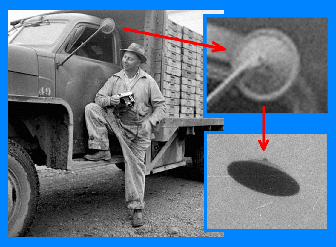 Skeptics have debunked Trent’s snapshots, remarking that the object was likely a small model hung from the power lines visible at the top of the frame, and that it bears a suspiciously strong resemblance to a side-view mirror from the farmer’s truck.