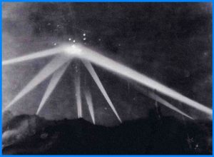 Also referred to as “The Great Los Angeles Air Raid,” this barrage of anti-aircraft fire directed at what artillerymen took to be Japanese bombers over Los Angeles during the night of February 24-25, 1942, was probably triggered by nervous soldiers in a post-Pearl Harbor environment mistaking meteorological balloons released earlier that day for the enemy. Based on a grainy photograph of multiple search lights trained on an indistinct object in the sky that ran in the L.A. Times a day later, UFOlogists have argued that this incident amounts to an example of an early UFO sighting.