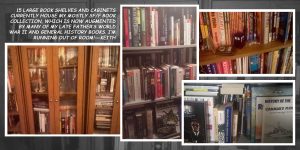 With my father’s passing six years ago, I inherited much of his extensive collection of World War II and general history books, and my shelving units are now stacked with books two and three rows deep! It’s all a jumble since I unpacked dad’s book boxes and added his collection to mine. I’m pretty much out of space and plan to remodel one of the soon-to-be-vacated children’s bedrooms as a library–a visit to IKEA is in my future!