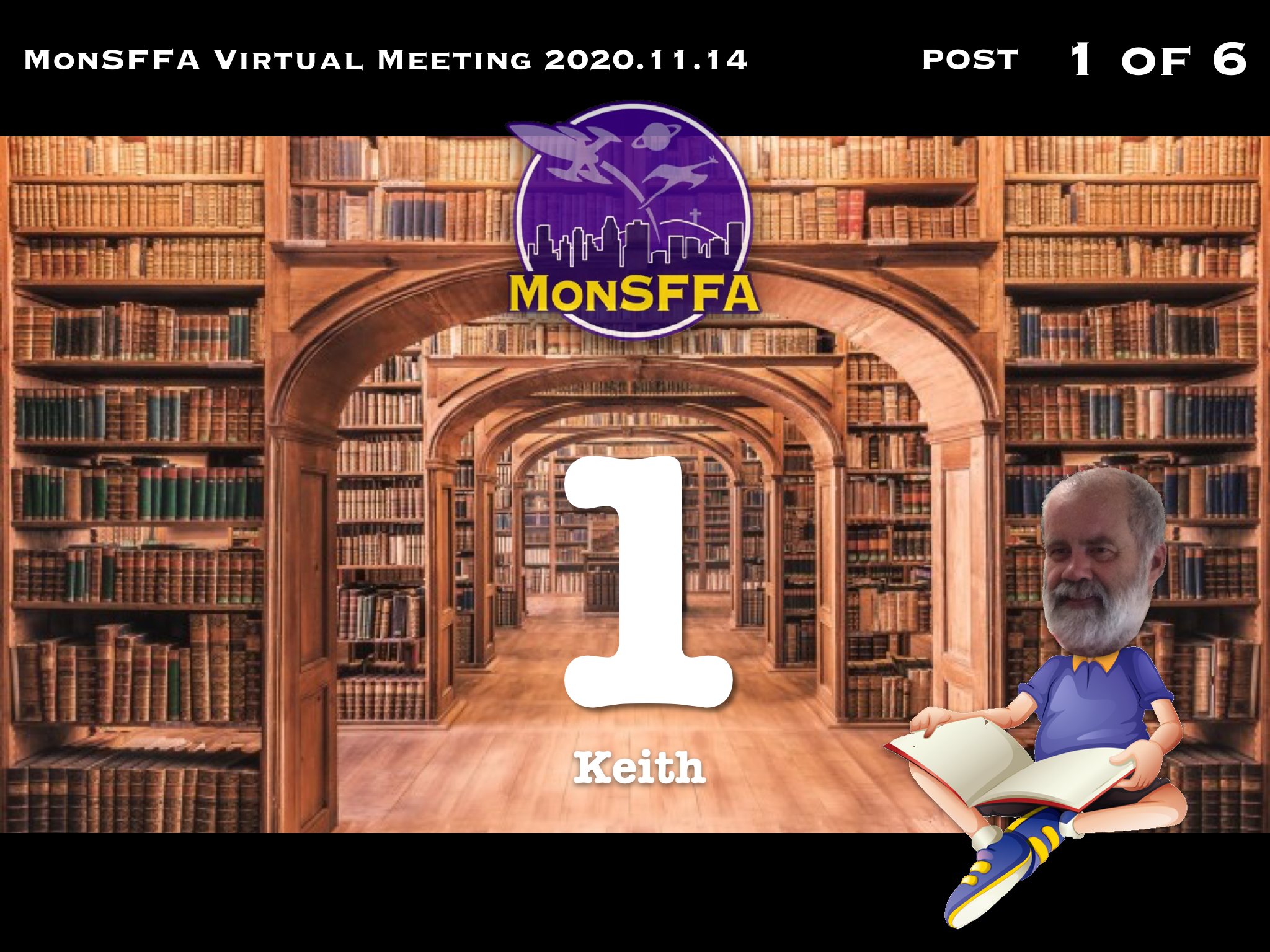This is post 1 of 6 related posts which together make up our November 14, 2020, DIY, Virtual MonSFFA Meeting. Before we open the book on today’s online conclave, we have regrettable news to pass along concerning one of our own: