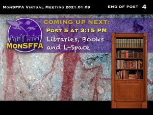 MEMBERSHIP FEES: MonSFFA has always been (and always will be) primarily a social club, so when we had to suspend in-person meetings, we also suspended the fees. This was not a great hardship as we were also not paying for a hotel room. However, while our expenses are lower, they are not insignificant. For one thing, the fees for our website and domain name come due this year, and we have to pay for a year’s subscription to Zoom. Though WARP is only being mailed to members without Internet, it is still being printed in hopes that we will all be able to get together again someday. We have had no fundraising, none at all, not even the snack bar!