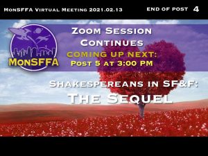 MEMBERSHIP FEES: MonSFFA has always been (and always will be) primarily a social club, so when we had to suspend in-person meetings, we also suspended the fees. This was not a great hardship as we were also not paying for a hotel room. However, while our expenses are lower, they are not insignificant. For one thing, the fees for our website and domain name come due this year, and we have to pay for a year’s subscription to Zoom. Though WARP is only being mailed to members without Internet, it is still being printed in hopes that we will all be able to get together again someday. We have had no fundraising, none at all, not even the snack bar!
