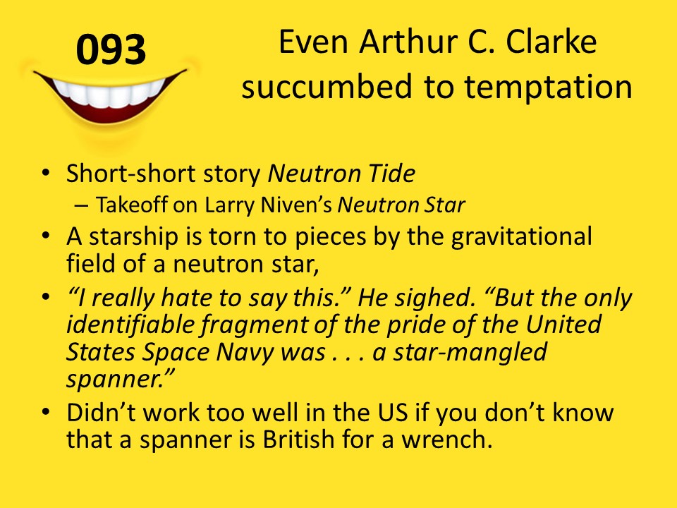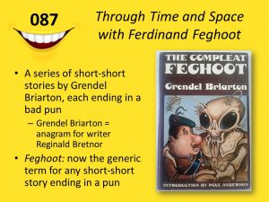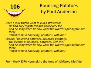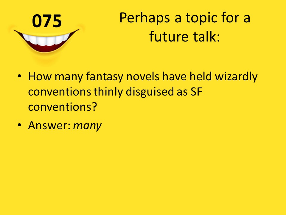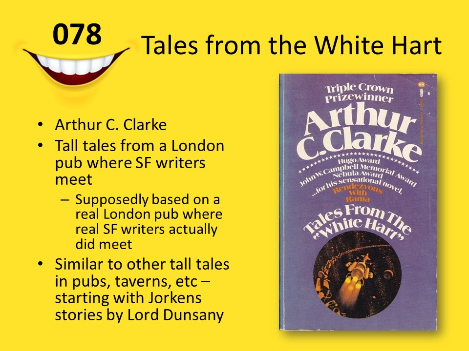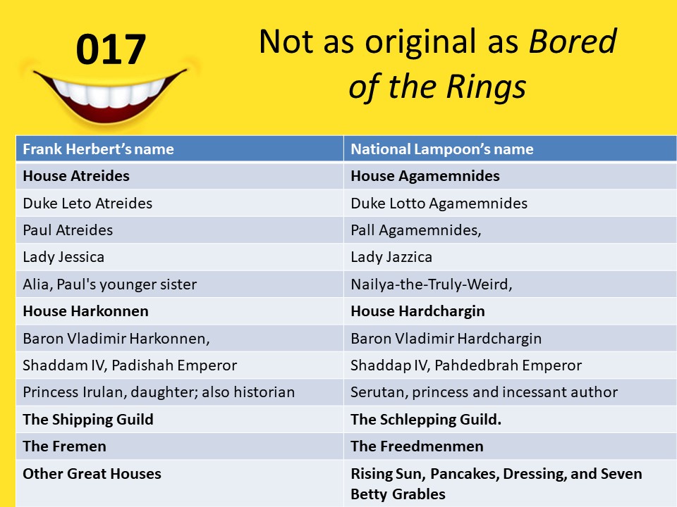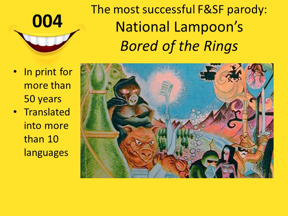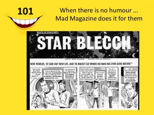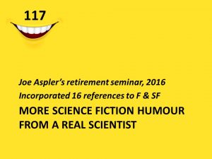 Science fiction and fantasy have a long history of taking themselves seriously. Very seriously. All too seriously. There have been successful SF and fantasy humourists of course. In recent months I talked about the fractured fantasies of Terry Pratchett and Tom Holt. However, humour in hard science fiction is rarer. A good parody is a joy to behold. There have been some good parodies …. And some not so good. In the next hour, I’ll give examples of humour, parodies, and puns in science fiction and fantasy. Professional warning: you will find some real science and some real science jokes here.