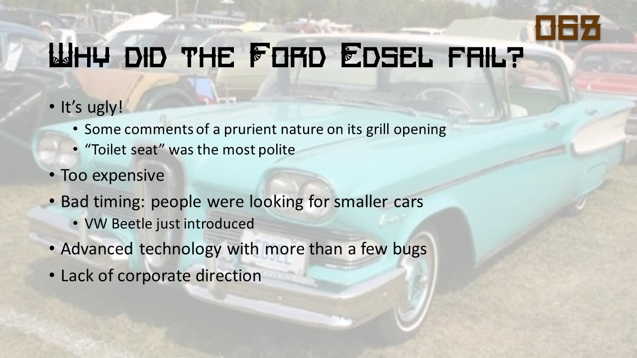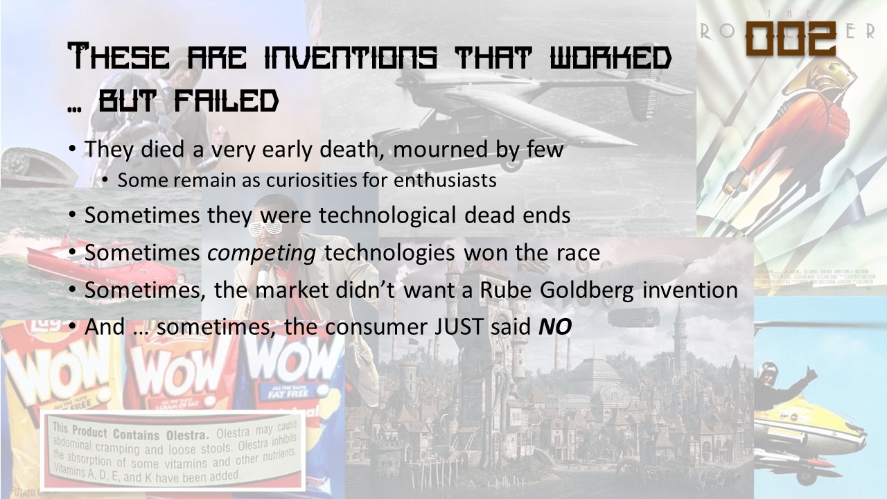 Or is it? The paths of modern civilization are strewn with the wreckage of failed inventions. Some were noble efforts that lost out to better or more versatile technologies. Some represented the expenditure of vast sums of money on products that make us say WTF were they even thinking? Some represented the wishful thinking of generations of SF fans and other futurists.