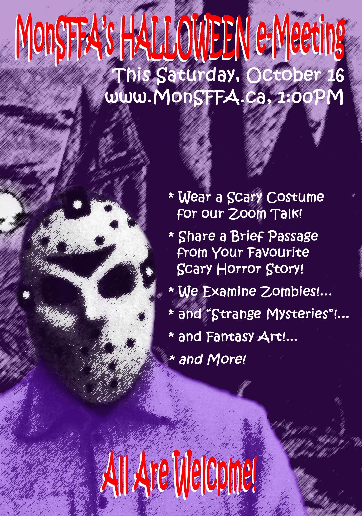 We invite you join us for our special Halloween-themed e-meeting this upcoming Saturday afternoon, October 16, beginning at 1:00PM right here on this, MonSFFA’s official Web site (www.MonSFFA.ca)!