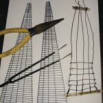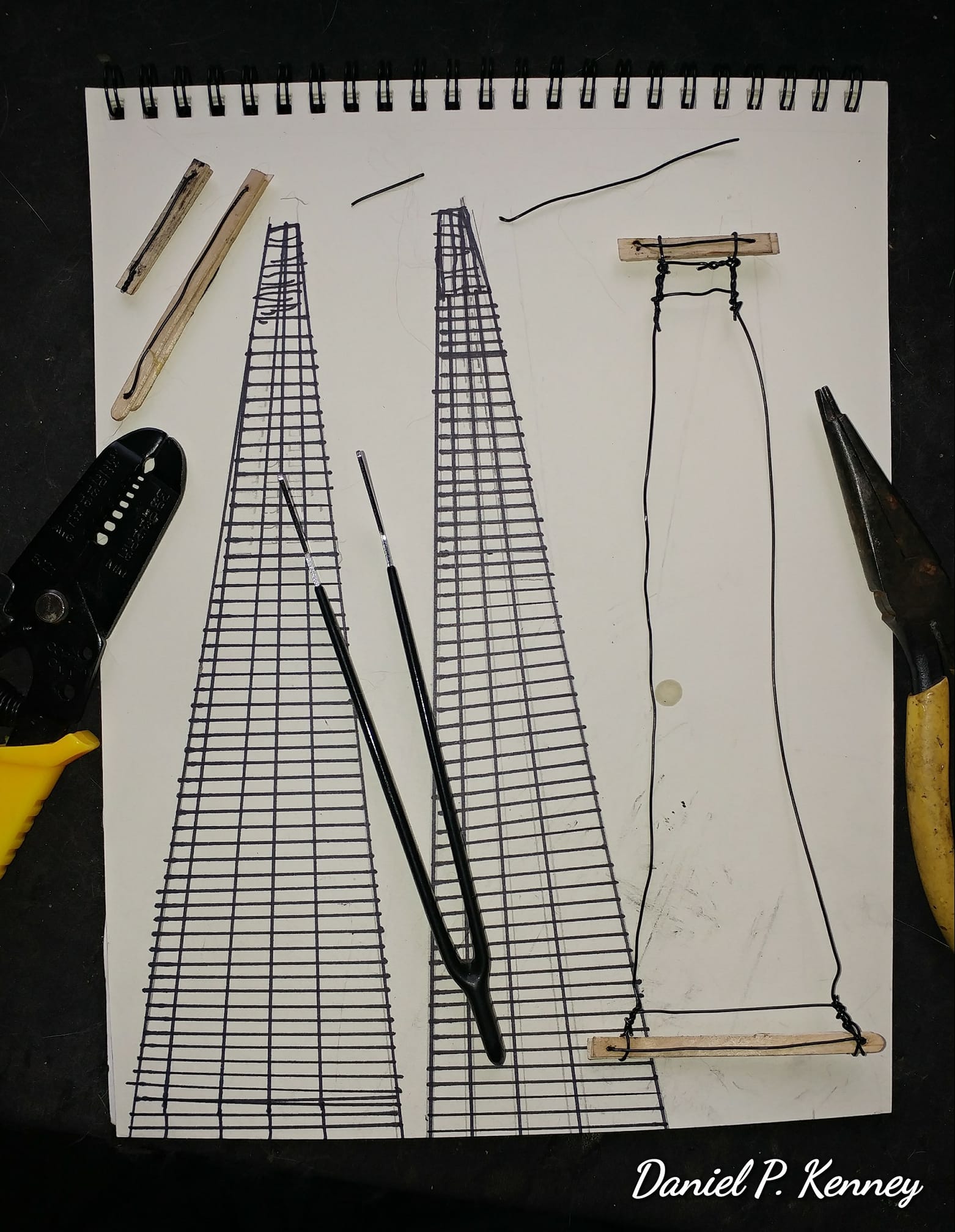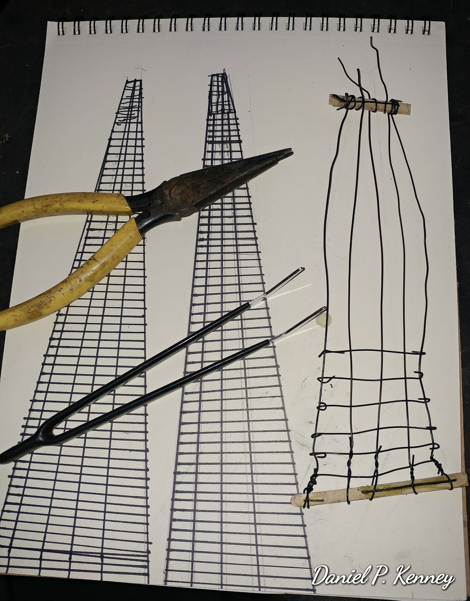 Dan Kenney is adding ratlines to his pirate ship, which in a former life was a Chinese junk. The ratlines are metal, he will straighten them later.
