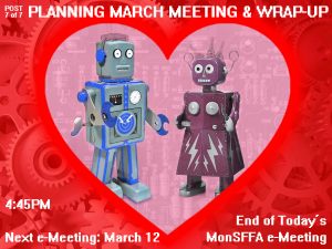Before we wrap things up for the afternoon, we’ll put together our agenda for next month’s e-meeting, scheduled for Saturday, March 12. This quick planning session will take place as a video-chat, but those unable to join in via Zoom may still contribute, live as we hash it all out, by sending us their thoughts, suggestions, and questions using, again, that “Leave a Comment” option.