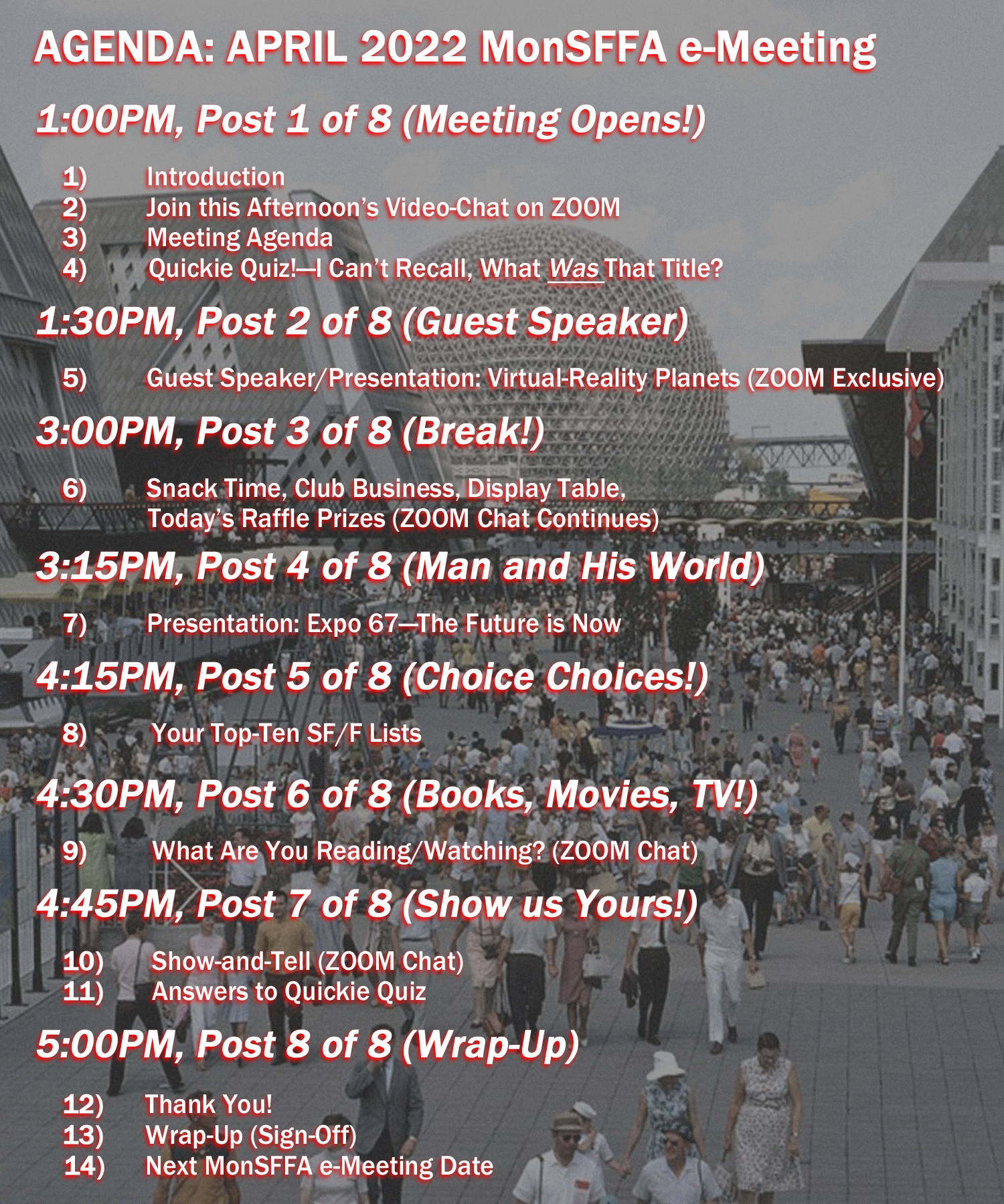 With a sixth wave upon us, we cannot yet, with reasonable safety for all, assemble in large numbers indoors. As such, this April 2022 virtual meeting has been prepared especially for you, MonSFFA’s membership. Sit back, check out each of the afternoon’s posts, scroll down leisurely through the proffered content, and enjoy!