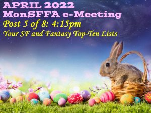 Those unable to join our video chat today can still submit in writing their own SF/F top-ten list via this post’s “Leave a Comment” option. So, again, we’re looking for your sci-fi, fantasy, or horror top-ten; could be, for instance, top ten space operas, top ten time-travel stories, Hugo-winning novels, classic sci-fi films, genre TV shows, spaceships, movie monsters, scariest horror movies, comic book superheroes, etc.