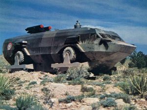 3) SPECTRUM PURSUIT VEHICLE (SPV): As seen in Gerry and Sylvia Anderson’s Supermarionation sci-fi television series Captain Scarlet and the Mysterons (1967-1968), this is a metallic-blue, high-speed, multi-wheeled, all-terrain, amphibious tank-like vehicle designed for ground pursuit and attack. Global security organization Spectrum has hidden SPVs in secret locations all over the world so that they may be quickly available when needed.