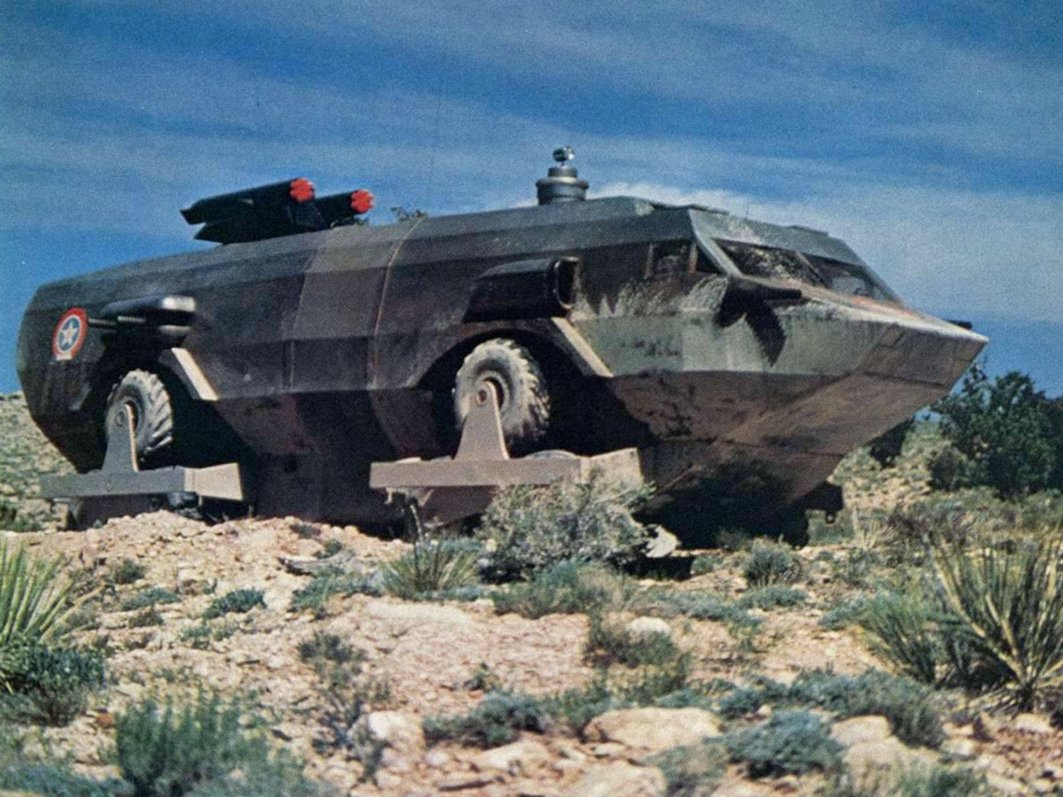 Built for the sci-fi film Damnation Alley (1977) by Dean Jeffries, a custom car designer/builder who fabricated numerous vehicles for the television and motion picture industries, the Landmaster is an articulated, amphibious, all-terrain vehicle featuring a unique trinary wheel arrangement that allows it to drive over very rugged terrain.