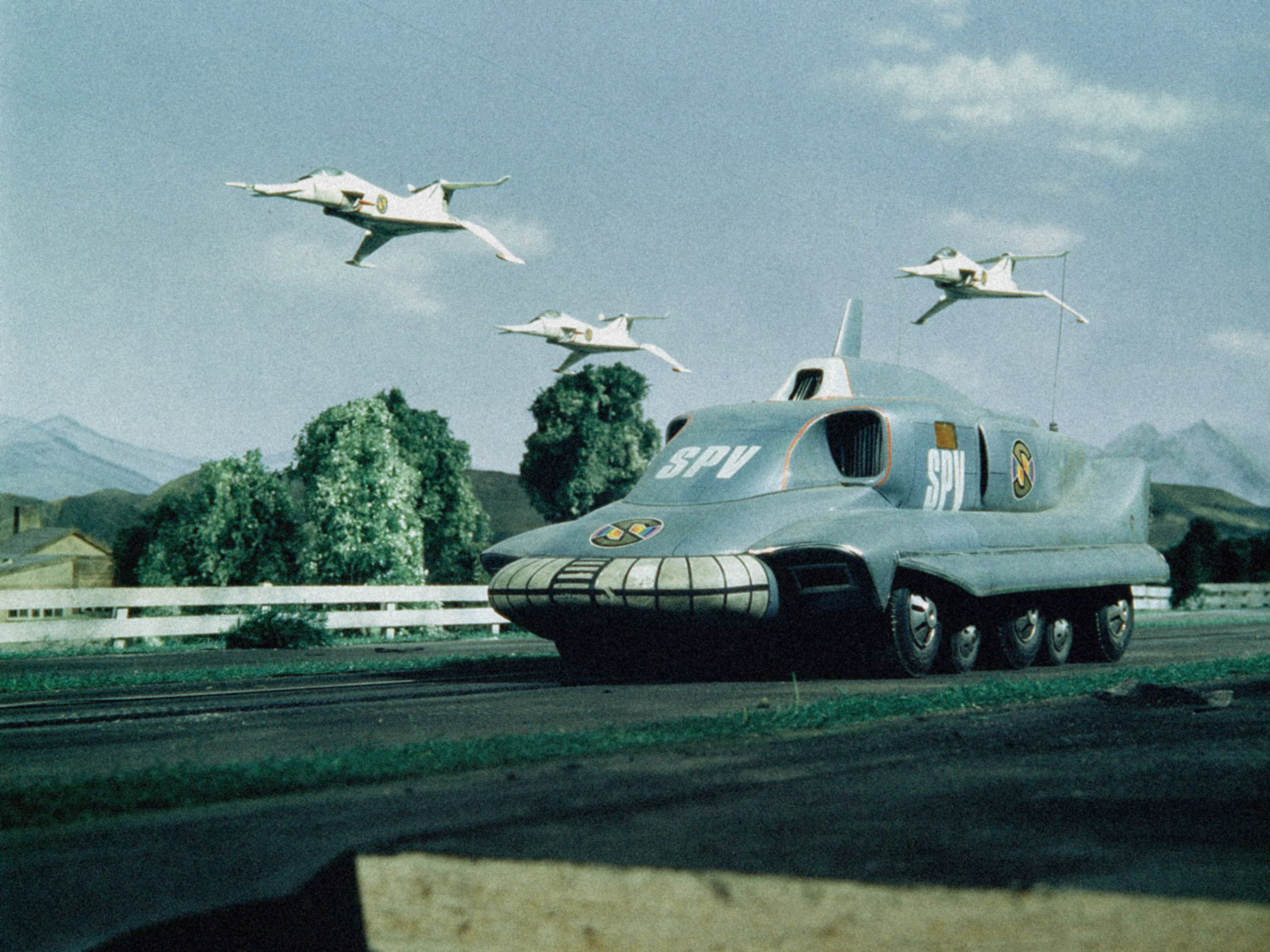 Fashioned as a futuristic Rolls-Royce, with the approval and cooperation of the distinguished British car-maker, the powerful, six-wheeled FAB 1, painted pink, as befits the lady, is usually driven by chauffeur Aloysius “Nosey” Parker. International Rescue’s resident genius, Brains, has equipped the vehicle with a bulletproof canopy, machine guns, grappling hooks, extendable tire studs for increased traction, and deployable hydrofoils and skis for travel over water or snow. The car can also put up a smoke-screen and dispense an oil-slick.