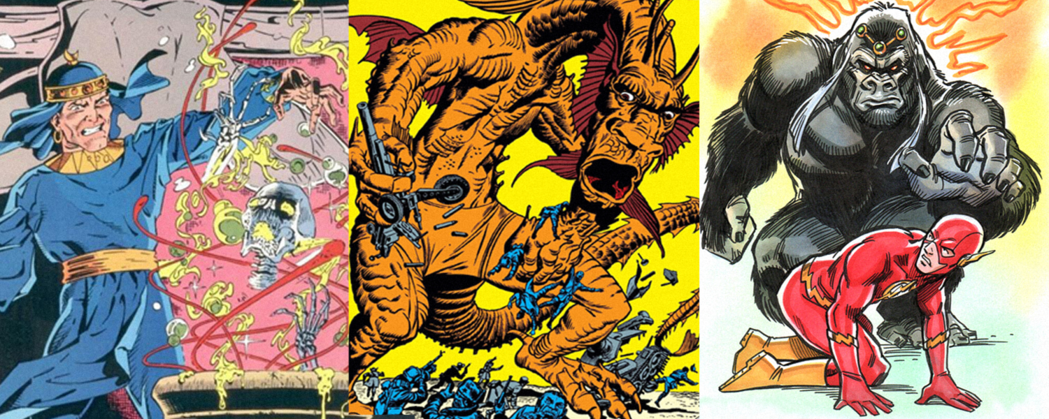 8) GORILLA GRODD, primarily an enemy of DC superhero The Flash, was an ordinary, African gorilla just hanging out in the jungle minding his own business until he was made super-smart one day by extraterrestrial influence. He developed, as well, telepathic and telekinetic abilities. His plot to seize control of Gorilla City, which he and his fellow enhanced apes built, and further, pursue world domination are foiled by The Flash. Grodd, however, returns to trouble the Scarlet Speedster and his allies.