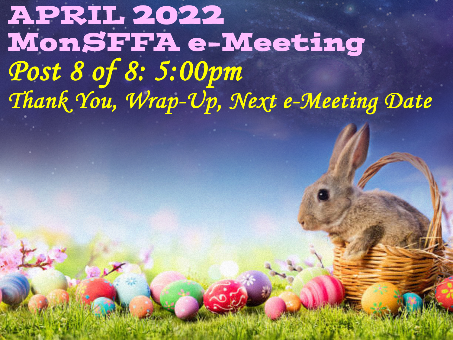 We will again convene right here at www.MonSFFA.ca on Saturday, May 14, for another in our ongoing series of MonSFFA e-meetings!