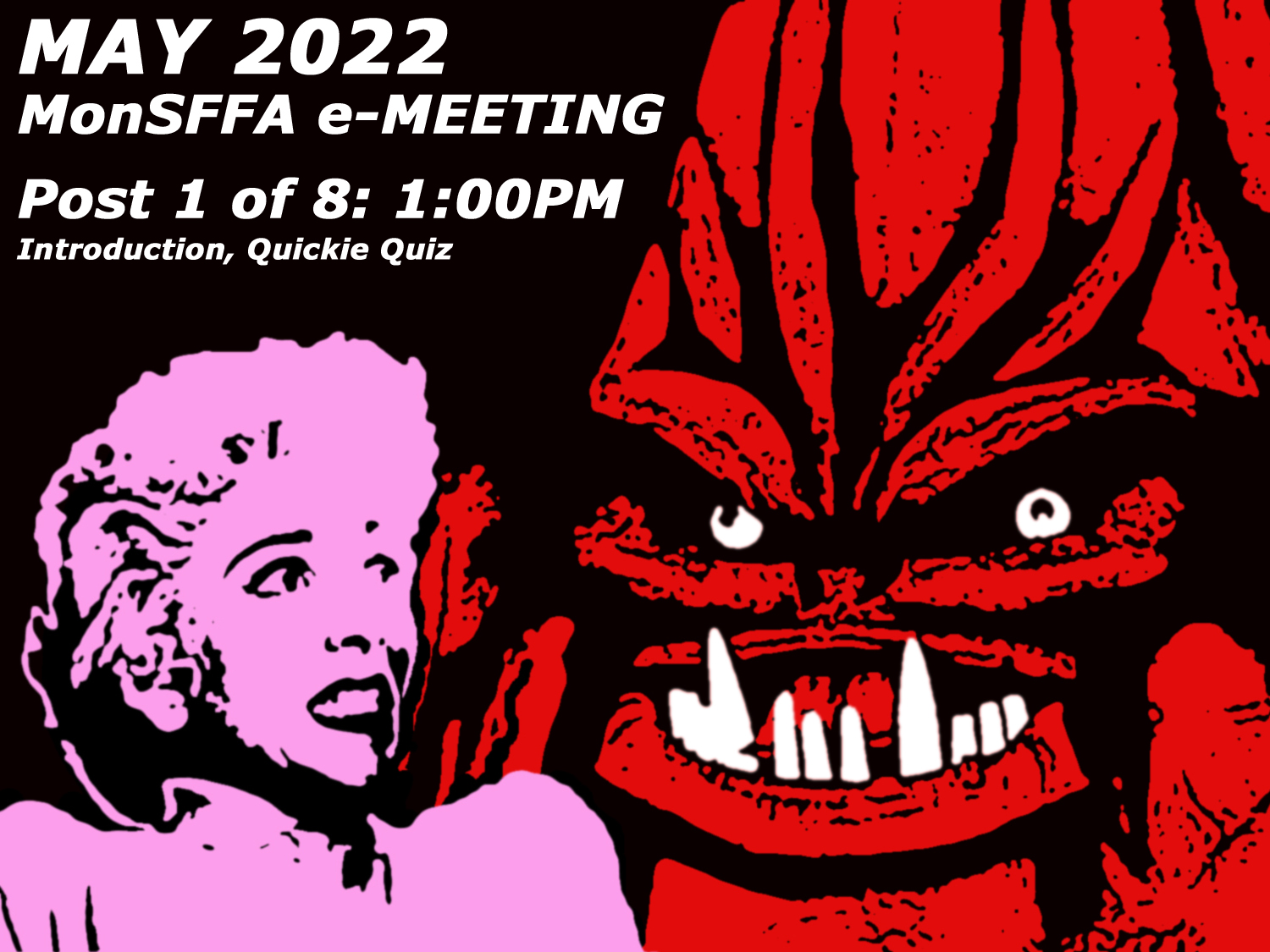 This MonSFFA e-Meeting will unfold both on ZOOM and right here on the club’s Web site over the course of the afternoon, beginning with this first post, and followed by subsequent posts at 1:30PM, 2:30PM, 2:45PM, 3:00PM, 3:15PM, and 4:15PM, with a final post at 4:45PM. All posts will be available concurrently on MonSFFA’s Facebook page (www.facebook.com/MonSFFA), however, note that the interface best suited for taking in this meeting is this very Web site.