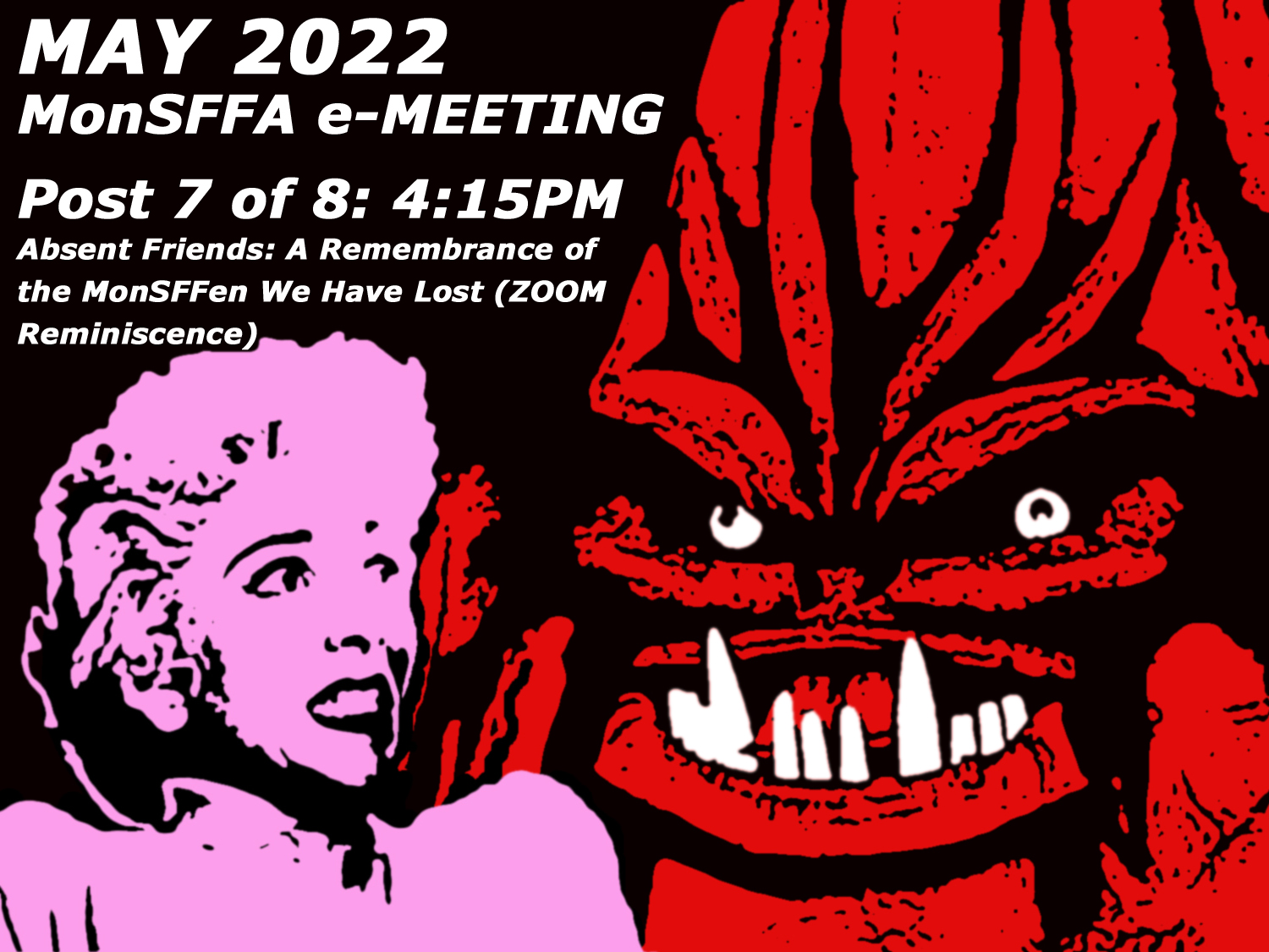 And so, as the pandemic seemingly wanes, we take this time to memorialize those dear departed MonSFFen and fannish friends we have lost, recently and over the years since our founding. On ZOOM for the next half hour or so, we will eulogize fellow club members, and other local friends-in-fandom, now departed but fondly remembered.