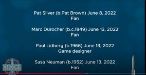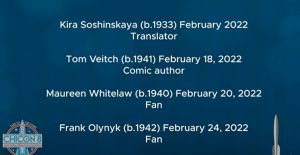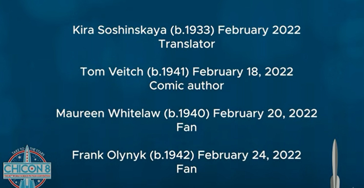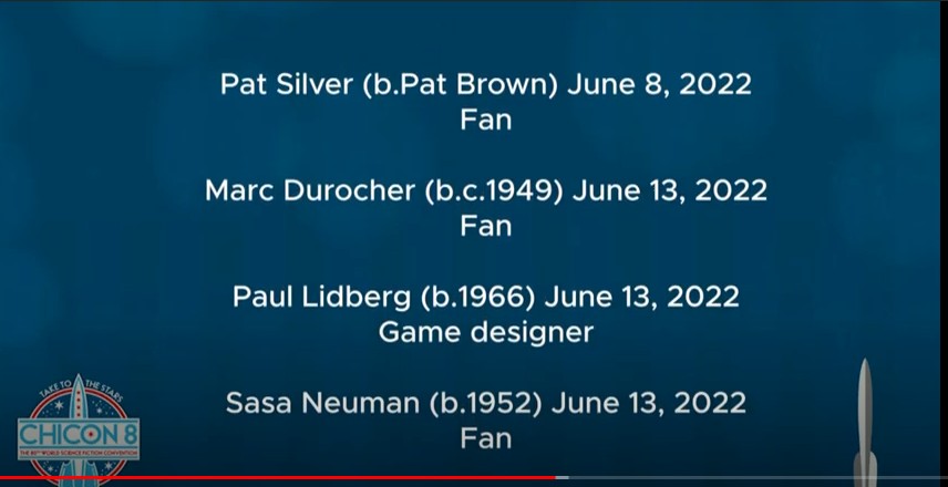 In Memoriam: We are grateful to Danny Sichel who arranged to have Maureen Whitelaw and Marc Durocher included in the ceremony at Chicon. Thanks also to Joe for sending the screen shots to our fb group.