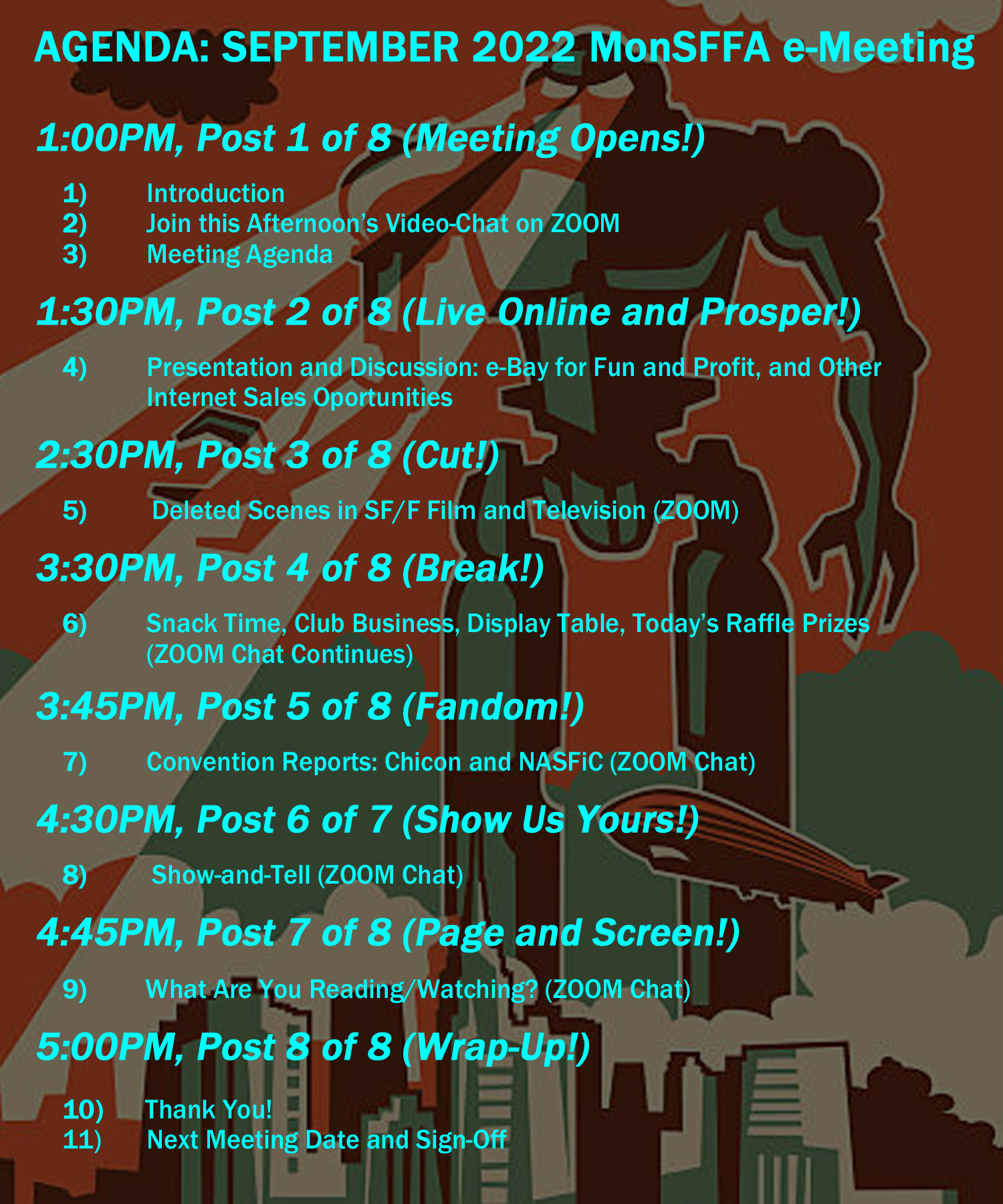 To join our ZOOM video-chat, which will run throughout the next few hours, simply click here and follow the prompts: This Afternoon’s MonSFFA e-Meeting on ZOOM