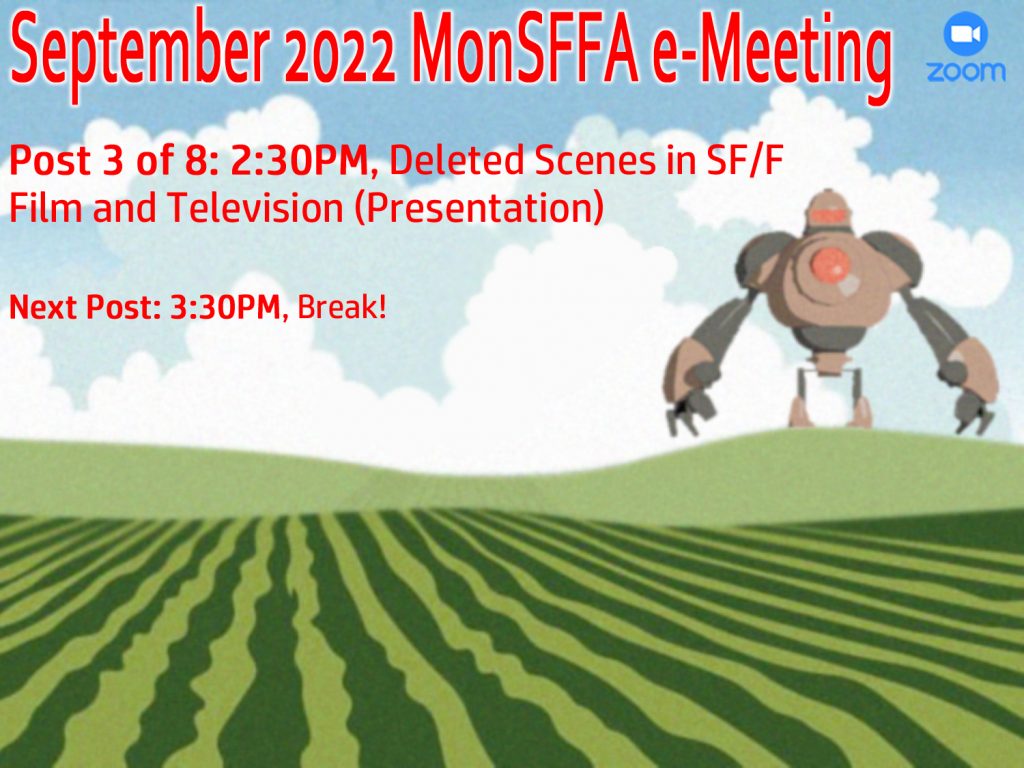 MonSFFA Website Post 3 of 8: Deleted Scenes in SF/F Film and Television 2022-09-10 Keith Braithwaite This is Post 3 of 8. Join our ZOOM chat as we look at deleted scenes in science fiction, fantasy, and horror films and television! Share this: Share on Facebook (Opens in new window) Facebook