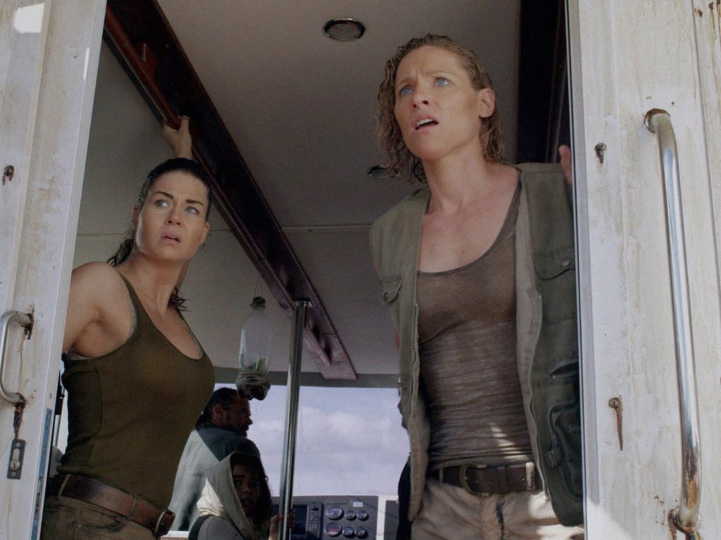 With ocean plankton unable to endure the warming waters, the ocean’s food chain is collapsing and almost all sea life is dying off, leaving only a great school of sharks, led by an alpha female. But with no fish to eat, the ocean’s apex predators must hunt for food above the surface. “And that’s us,” explains Planet of the Sharks’ Dr. Shayne Nichols, a scientist who is working with others to launch a rocket equipped with CO2 scrubbers into the high atmosphere, and so reverse the effects of climate change and lower sea levels. Yeah, that’ll work!