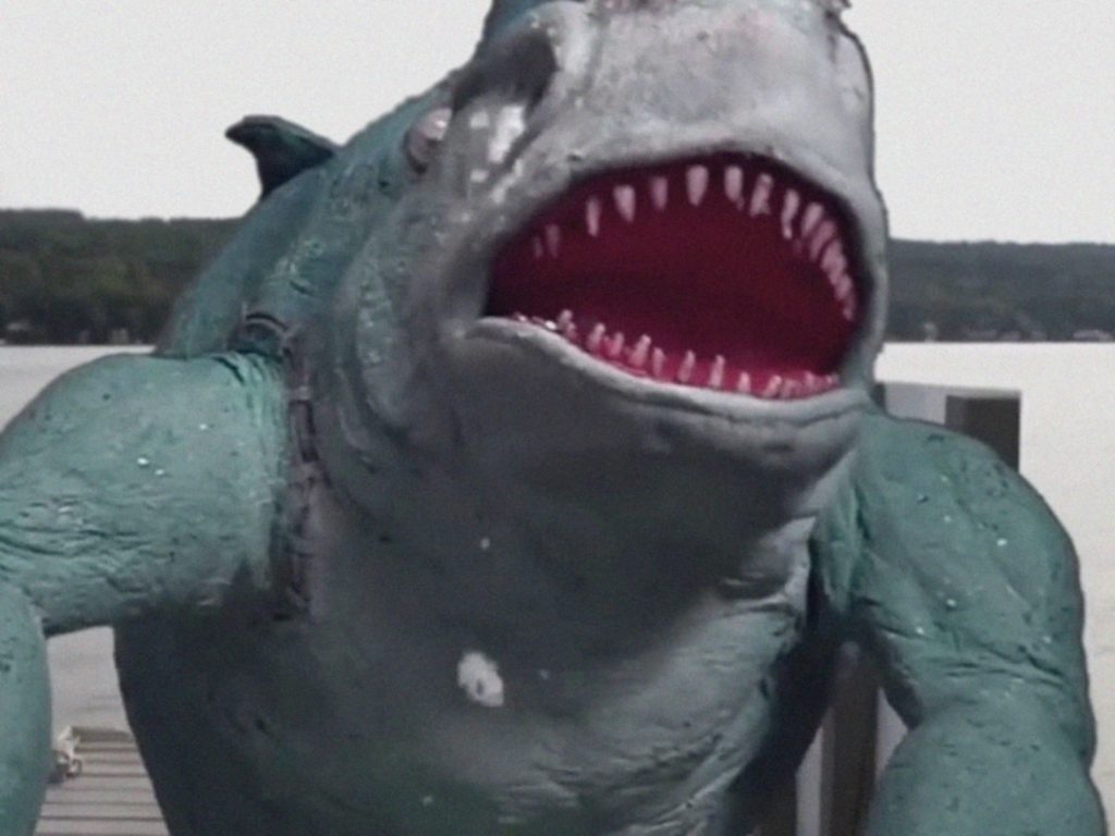 At one point, Greta Volkova, starring as Madge, delivers a line of awkwardly scripted foreshadowing with the mock gravitas appropriate to the occasion. “I’ve never seen a shark like that before,” she emotes. “It looked like a grotesque combination of different sharks.” She later pays nerdy, loving tribute to the Frankenstein story, rattling off a list of classic Frankenstein films produced by Universal and Hammer.