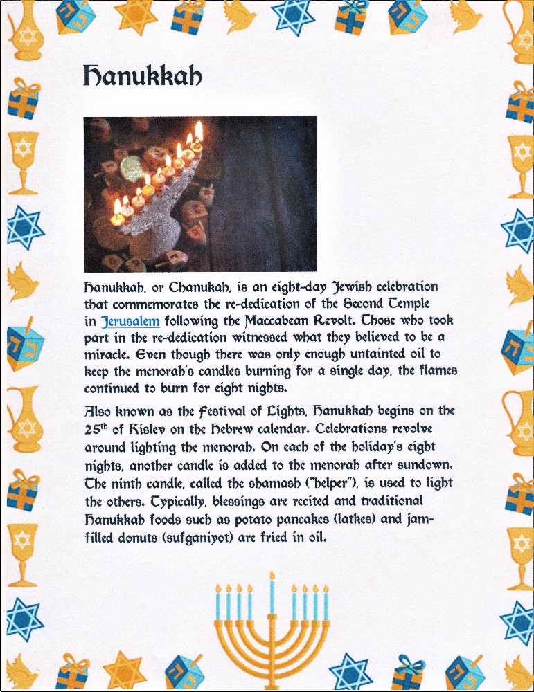 15) Gimmel, Nun, Hey, and Shin are the Hebrew letters traditionally inscribed on a dreidel, one on each of the four sides. A dreidel is a spinning top associated with Hanukkah, the Jewish Festival of Lights. The letters stand for the phrase “Nes gadôl hayah sham,” or in English, “A great miracle happened there.” In Israel, the phrase is modified slightly to read “Nes gadôl hayah poh,” or “A great miracle happened here.” But what are Kimar, Rigna, Stobo, and Shim?